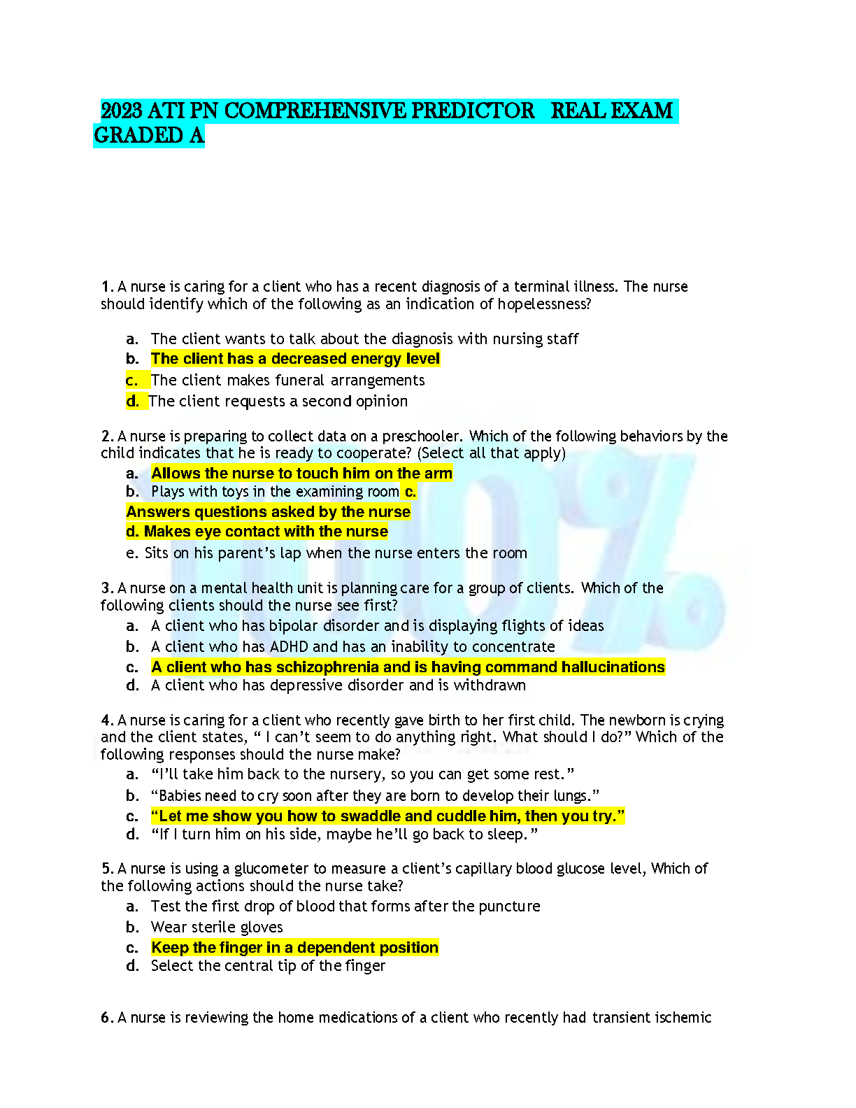 This resource contains practice questions from the 2023 ATI PN Comprehensive Predictor Real Exam, Graded A. It is designed to help nursing students prepare for their exams and achieve success on their first attempt, thus avoiding resits. The questions cover a range of nursing topics and are presented in a format similar to the actual exam.