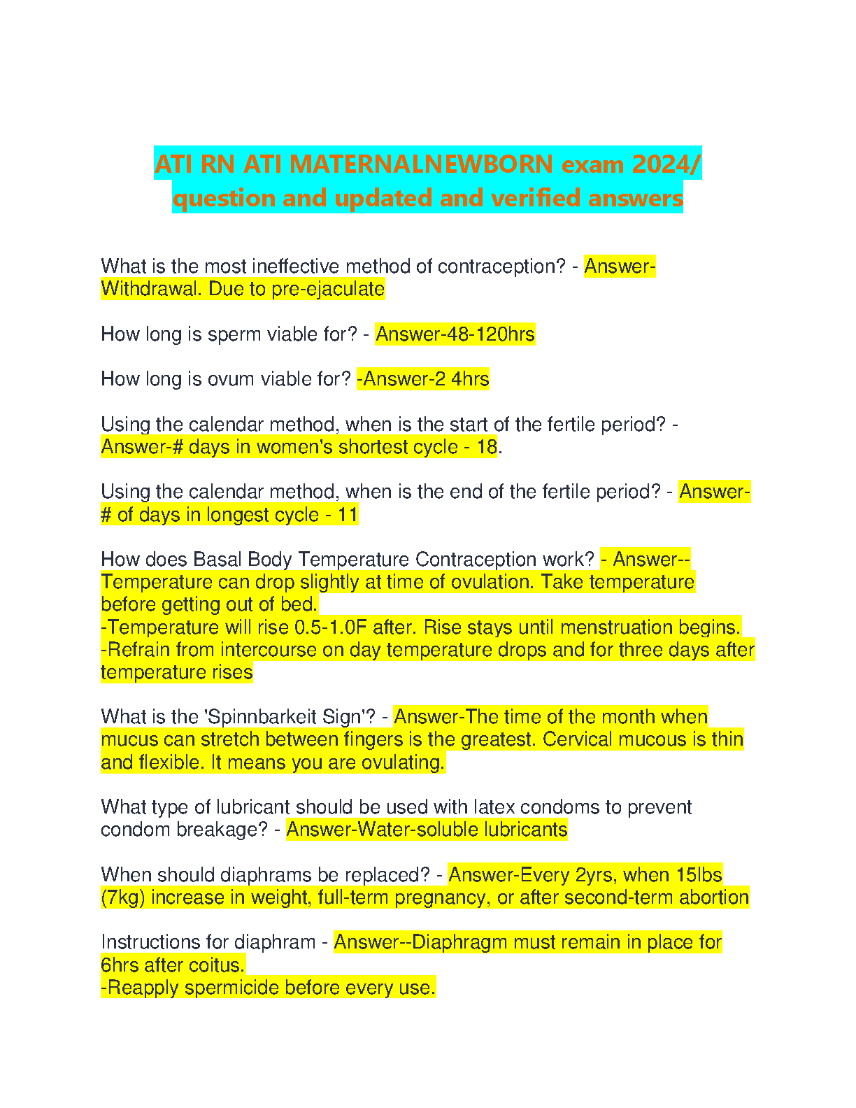 Master your ATI RN Maternal Newborn exams with this essential 2024-2025 test bank, provided by ATI. This resource features a collection of up-to-date questions and thoroughly verified answers, covering critical topics such as effective contraception methods, fertility awareness, maternal physiological changes, and essential newborn care. Designed to help nursing students prepare effectively, boost their confidence, and ensure first-attempt success, this guide is your key to avoiding costly resits and achieving your academic goals in maternal and newborn nursing.