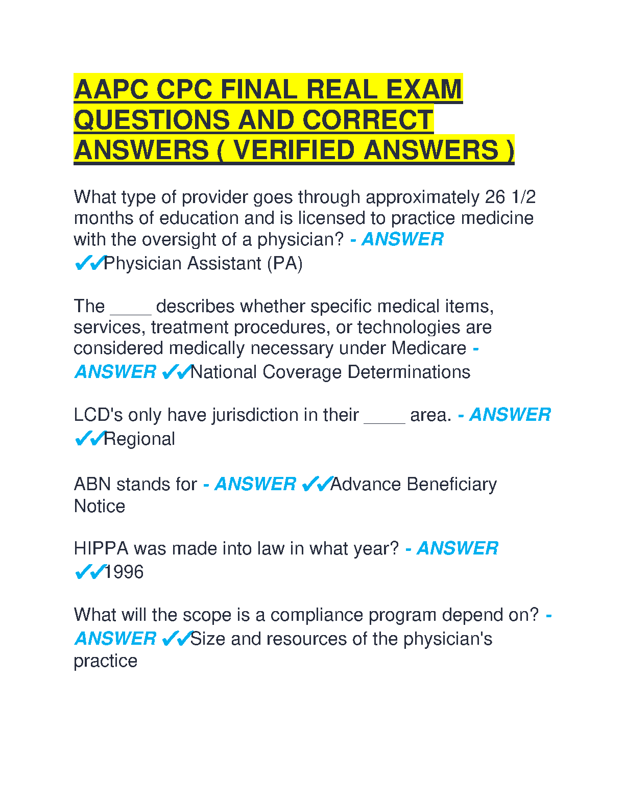 Master the AAPC CPC FINAL REAL EXAM with this comprehensive set of verified questions and answers. This study guide provides crucial insights into key concepts, including provider qualifications, medical necessity under Medicare (National Coverage Determinations), jurisdictional authority, Advance Beneficiary Notices (ABN), HIPAA law, and compliance program scope. Perfect for students aiming to pass their CPC certification on the first attempt and avoid resits, ensuring success for the 2025/2026 academic year.