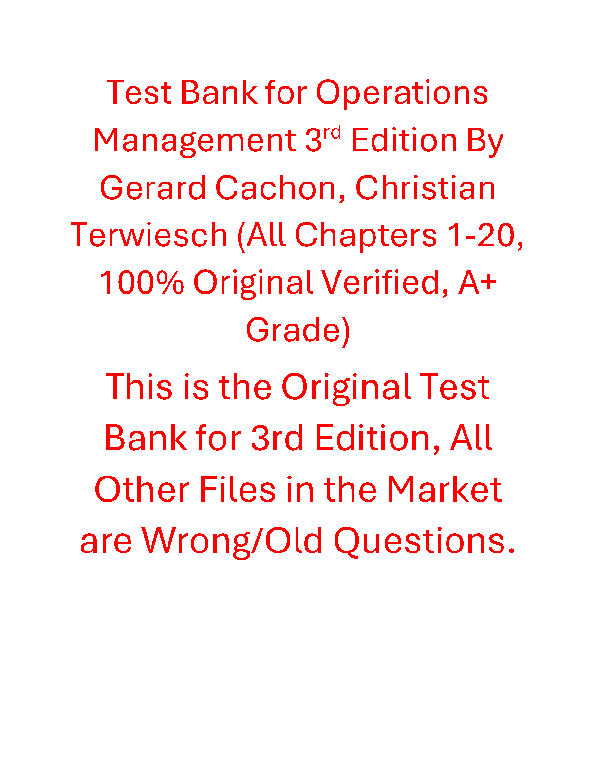 Master Operations Management with the 3rd Edition Test Bank by Gerard Cachon and Christian Terwiesch. This comprehensive resource covers all chapters (1-20) and offers 100% original, verified questions for A+ grade achievement. Unlike other market offerings, this test bank guarantees accurate and up-to-date content, helping you avoid resits and excel in your academic pursuits for the 2025/2026 academic year.