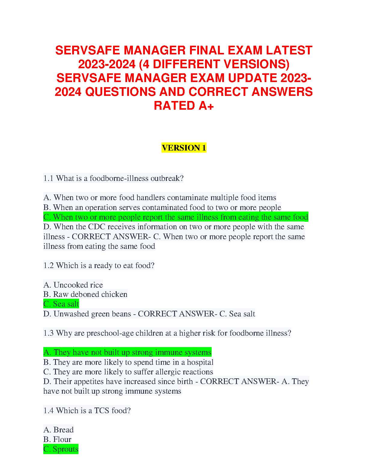 ServSafe Manager Exam 7th Edition Test Bank (National Restaurant Association) 2023-2024: 4 Versions with Expert Answers for Guaranteed First Attempt Pass