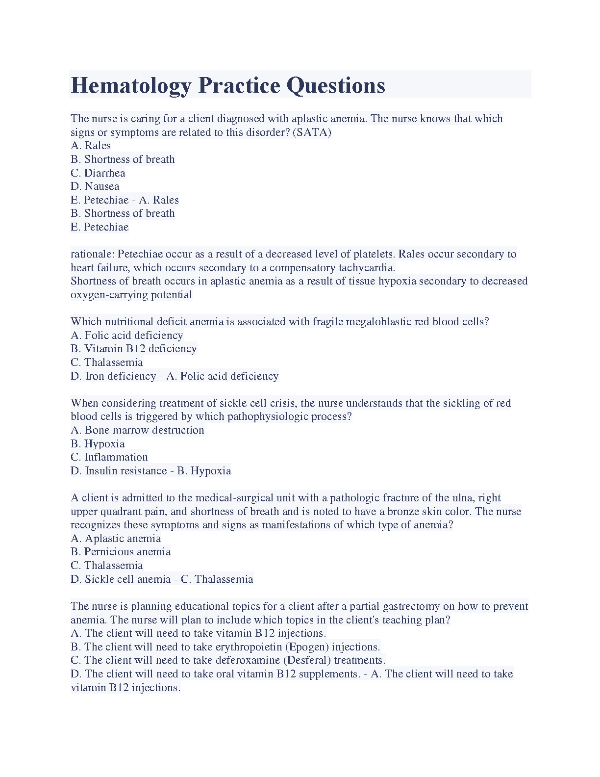 Unlock your potential in hematology with our comprehensive Test Bank and Practice Questions tailored for the 2025/2026 academic year. This essential resource features challenging, exam-style questions covering critical topics such as aplastic anemia, megaloblastic anemia, sickle cell crisis, pernicious anemia, and other vital hematological disorders. Designed specifically for nursing and medical students, these questions, complete with insightful rationales, will sharpen your knowledge, build your confidence, and equip you to pass your hematology exams on the very first attempt, helping you avoid costly and stressful resits.