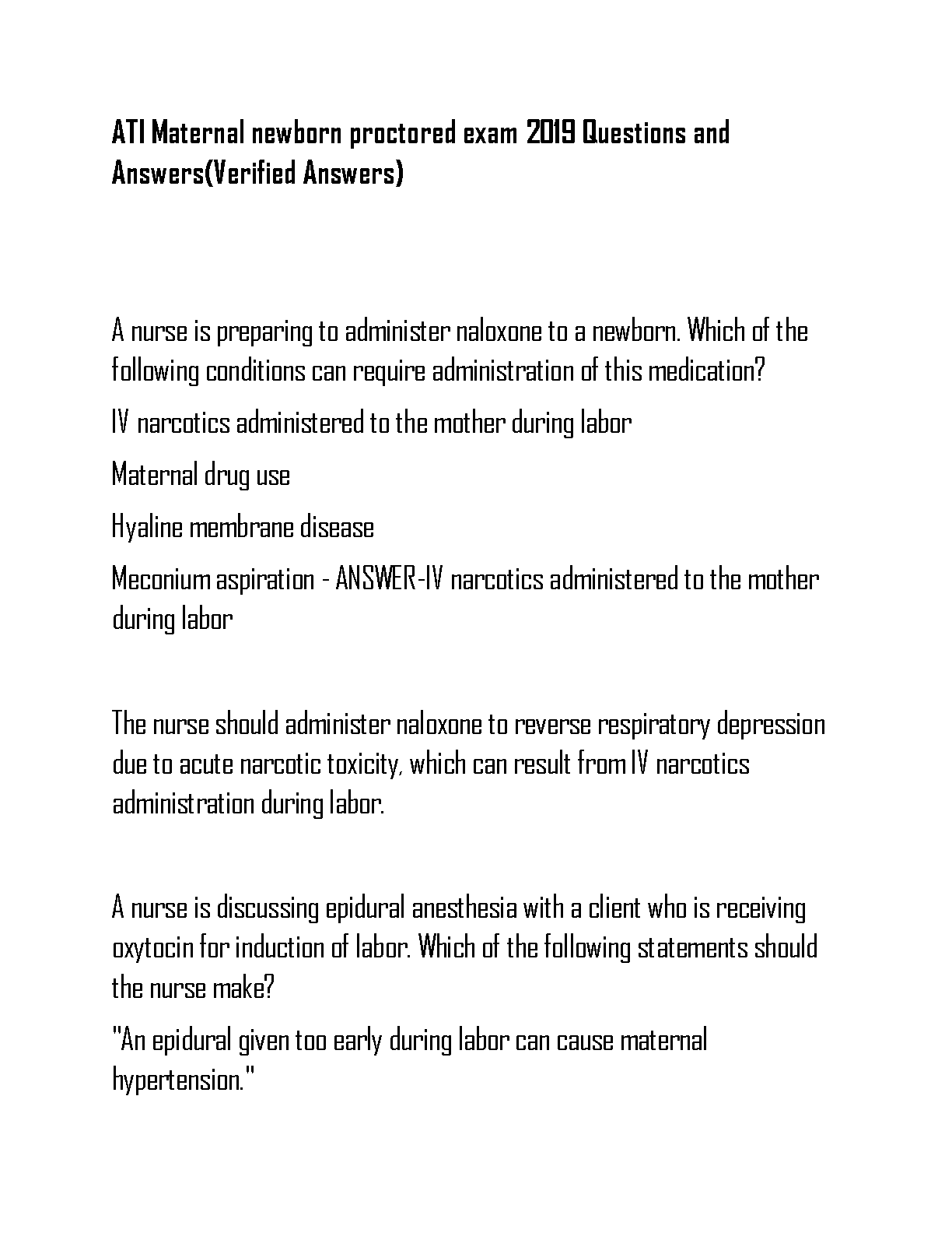 ATI Maternal Newborn Proctored Exam 2019: Comprehensive Q&A with Verified Solutions for 2025/2026 Nursing Success - Pass Your Boards on First Attempt