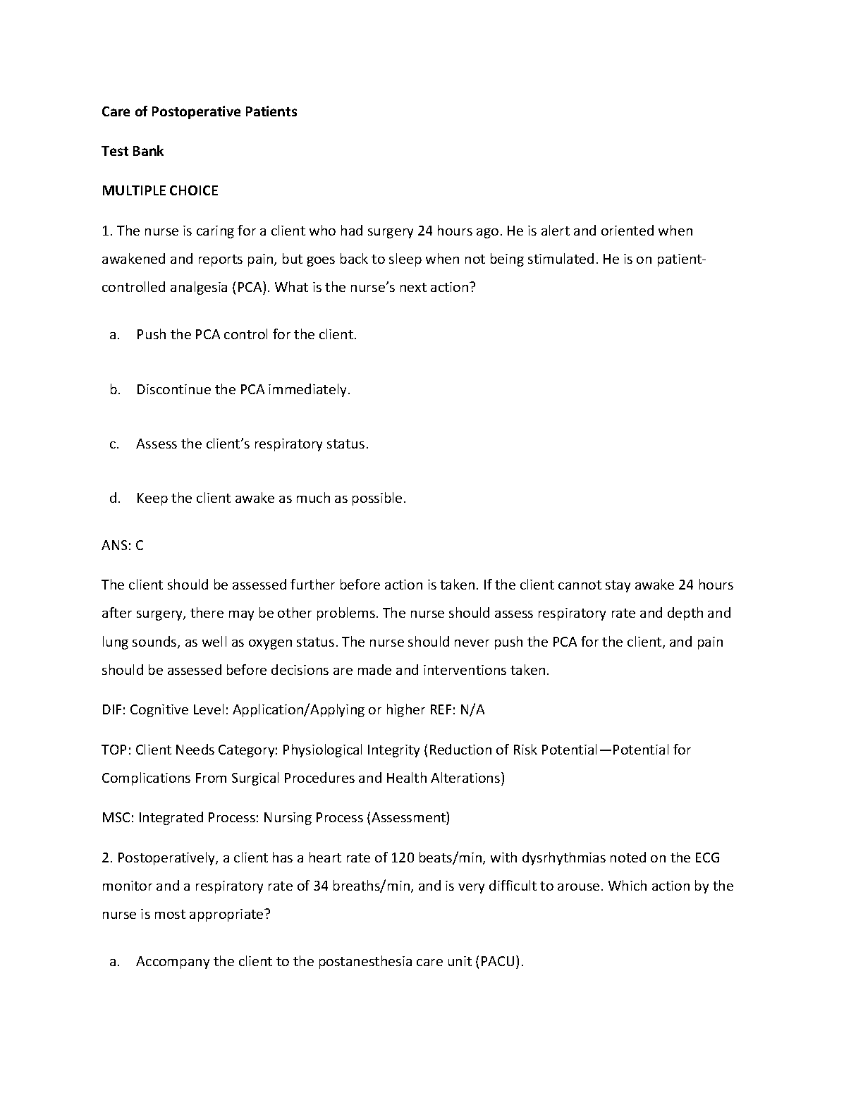 Master postoperative patient care and ace your exams on the first attempt with this essential test bank. Designed for the 2025/2026 academic year, this resource covers critical concepts in patient monitoring, pain management, and assessment, including patient-controlled analgesia (PCA) and post-anesthesia care unit (PACU) scenarios. Avoid resits and ensure your success with expertly crafted multiple-choice questions and detailed explanations.
