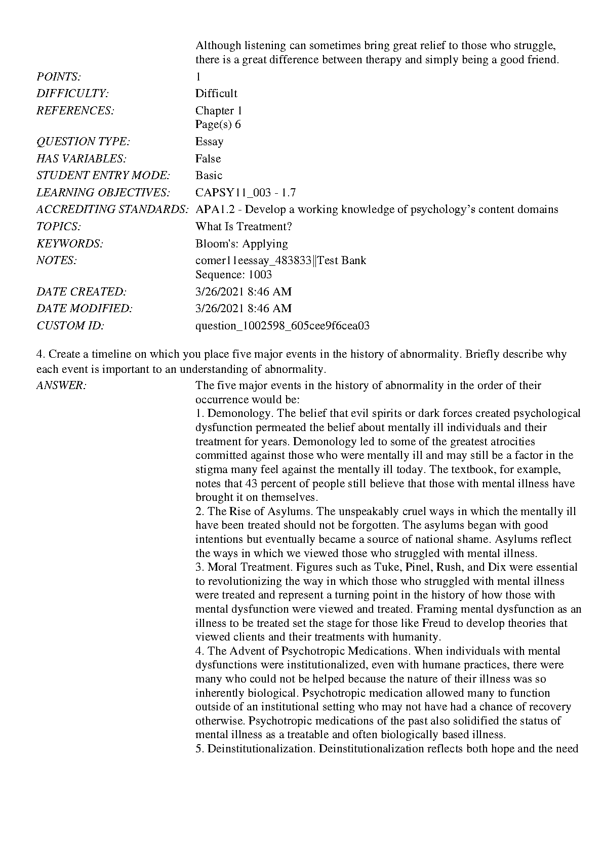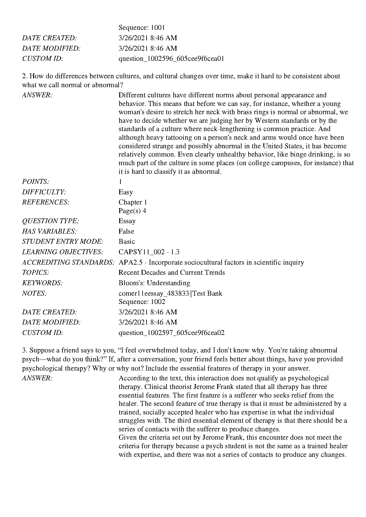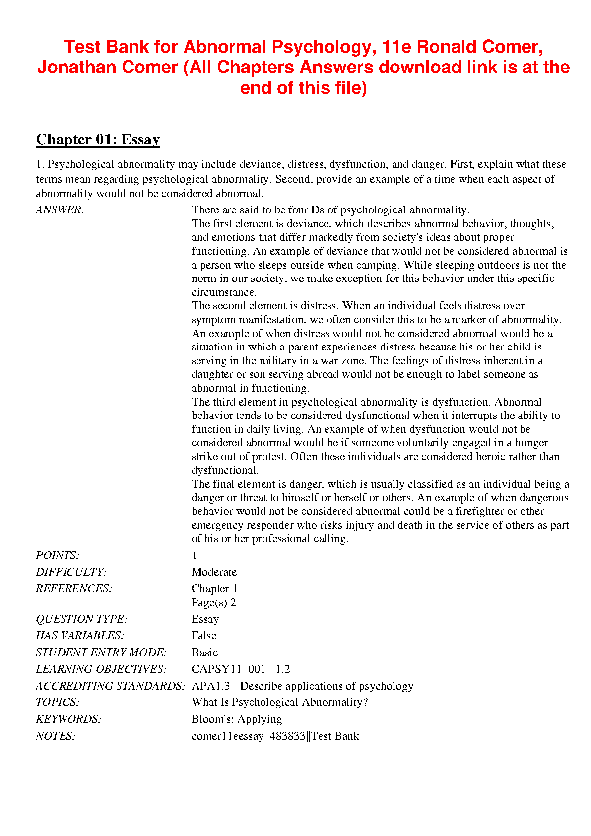 Test Bank for Abnormal Psychology, 11th Edition by Ronald J. Comer: Chapter 1 Essay Questions & Answers