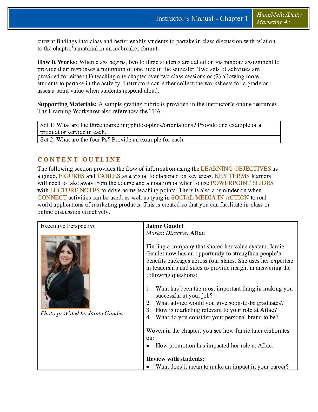 Unlock comprehensive teaching and assessment strategies with this Instructor's Manual for Marketing, 4th Edition by Shelby D. Hunt, Jeffrey A. Mello, & Greg Deitz. Specifically designed for Chapter 1, 'Why Marketing Matters to You,' this invaluable resource provides instructors with detailed learning objectives, key terms, and thought-provoking activities to engage students. Facilitate dynamic class discussions and ensure students master essential marketing concepts for the 2025/2026 academic year. Ideal for instructors aiming to prepare students thoroughly for exams and help them succeed on their first attempt, minimizing the need for resits. This manual includes guidance on integrating learning worksheets and their corresponding keys, making it a critical tool for effective instruction and student achievement.