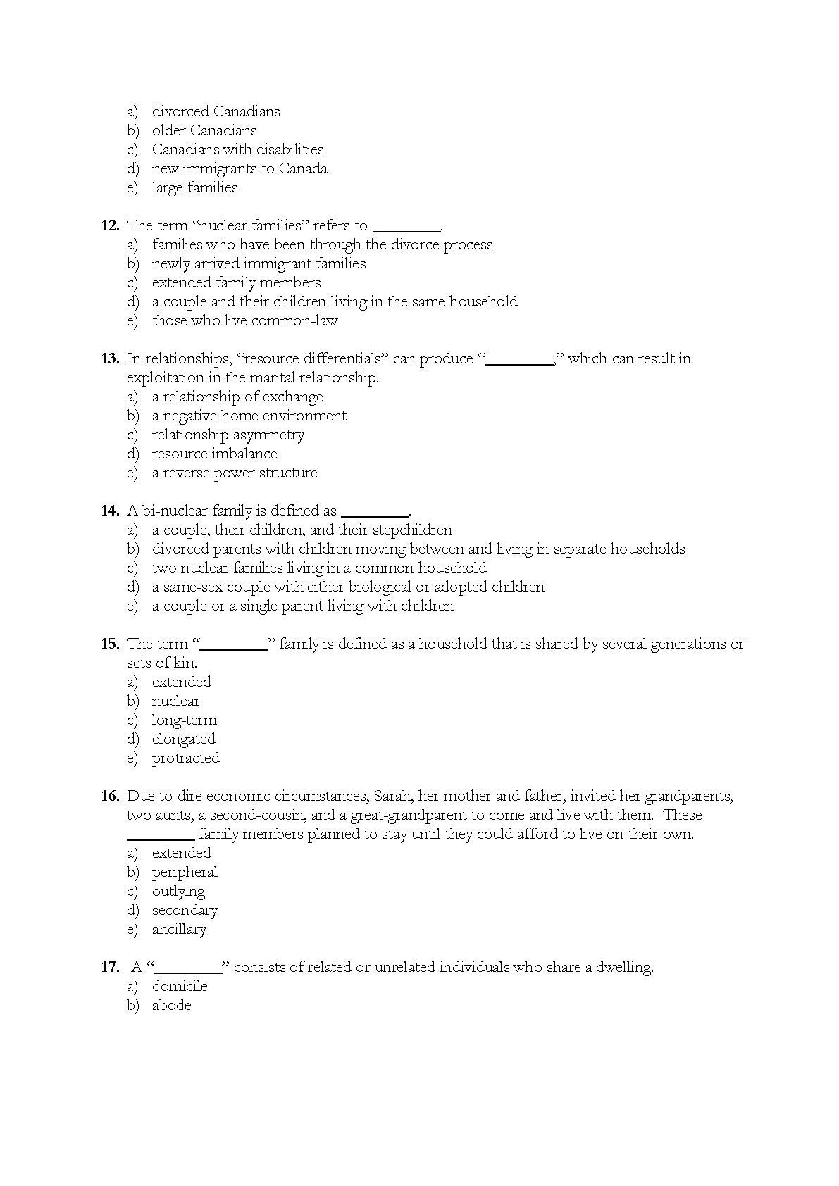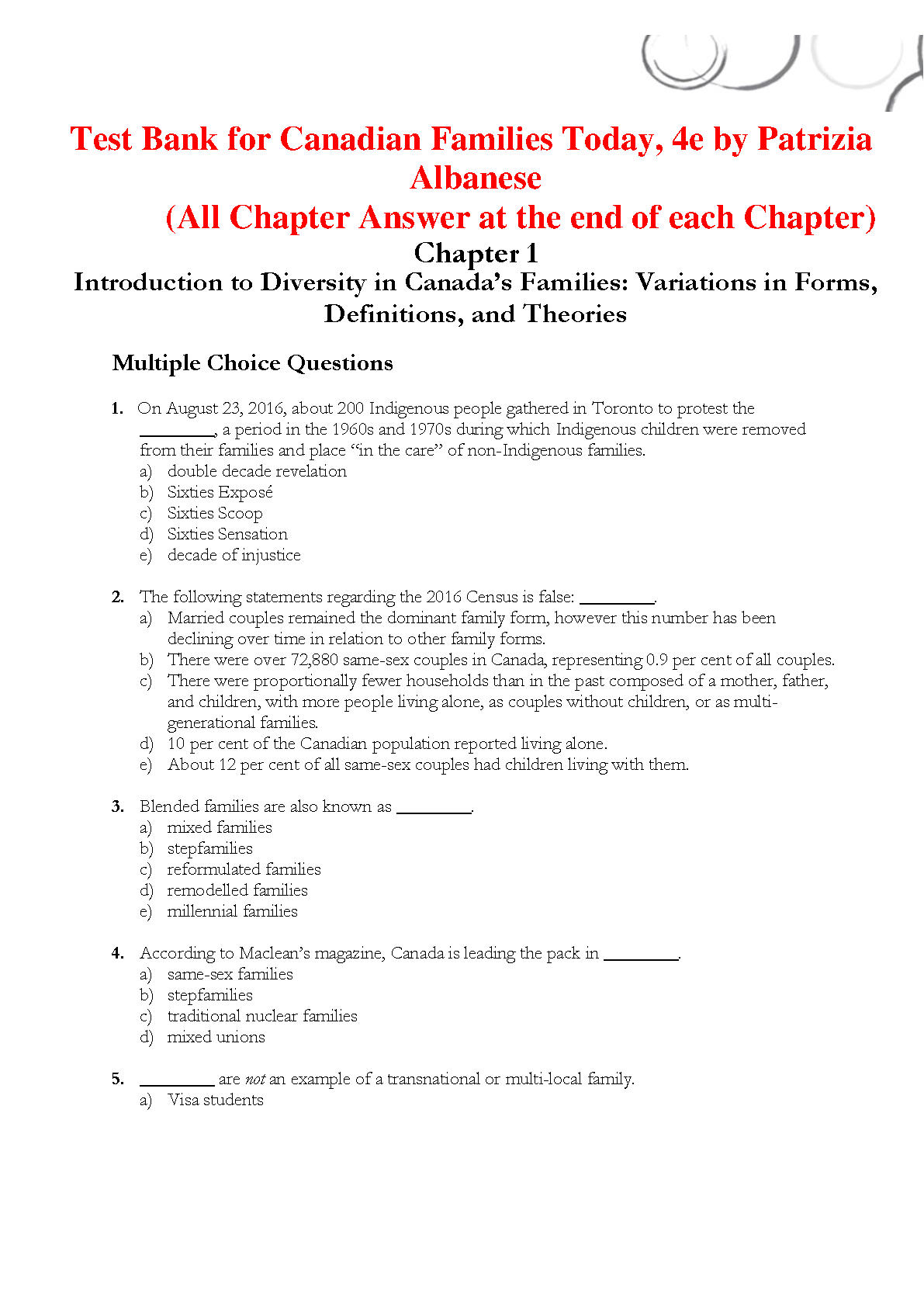 Master 'Canadian Families Today, 4th Edition' by Patrizia Albanese with this comprehensive Test Bank. Featuring an extensive collection of multiple-choice questions for all chapters, including detailed answers at the end of each section, this resource is meticulously designed for student success. Prepare effectively for your exams by testing your knowledge on topics like 'Introduction to Diversity in Canada's Families: Variations in Forms, Definitions, and Theories' and ensuring you're ready to achieve top grades on your first attempt. Perfect for in-depth study and self-assessment, this test bank helps you avoid resits and confidently pass your courses.