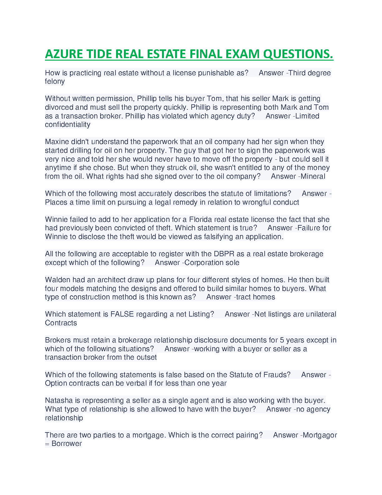 Unlock your potential in real estate with this expertly curated Azure Tide Real Estate Final Exam Test Bank. Designed for the 2025/2026 academic year, this essential resource features a wealth of challenging questions and detailed answers covering crucial topics such as real estate law, agency relationships, contracts, property rights, and licensing regulations. Ideal for students and professionals, this test bank provides the ultimate preparation tool to ensure you ace your real estate licensing exams on your first attempt, saving you time and avoiding costly resits. Build confidence and deepen your understanding of core real estate principles for a successful career.