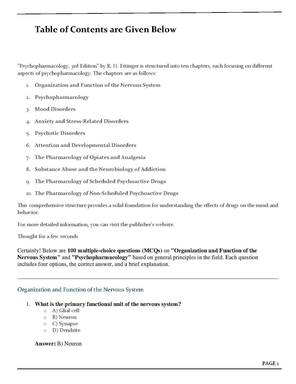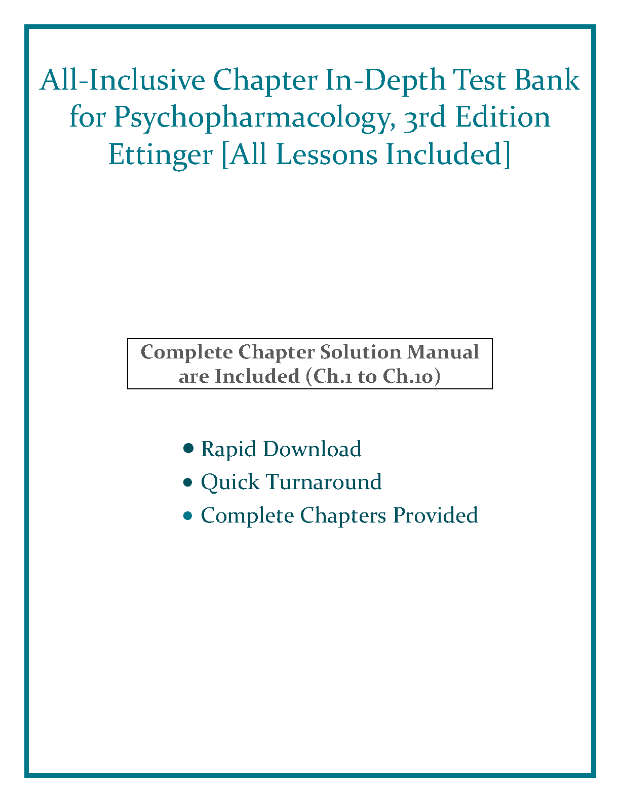 Ace your Psychopharmacology exam with this comprehensive test bank and solution manual for Ettinger's 3rd edition. Includes all chapters (1-10), offering rapid download, quick turnaround, and complete chapter solutions for first-attempt exam success. Avoid resits and achieve your academic goals!
