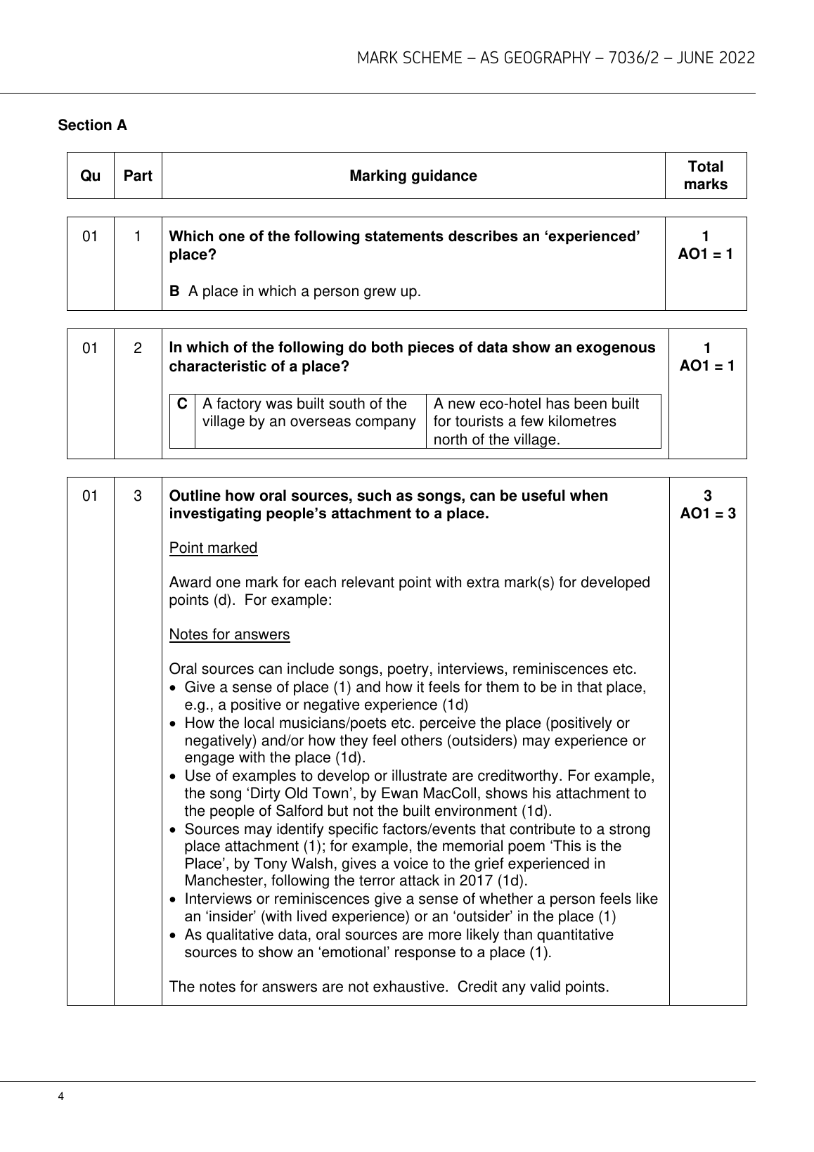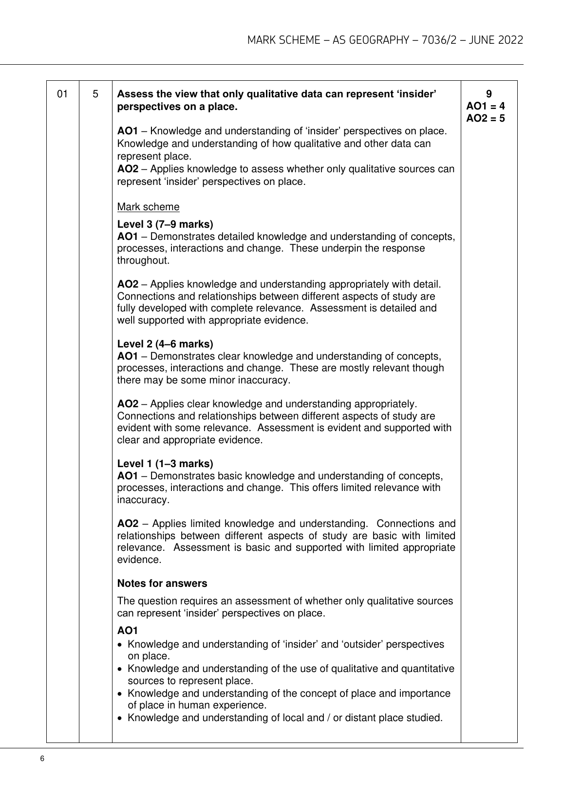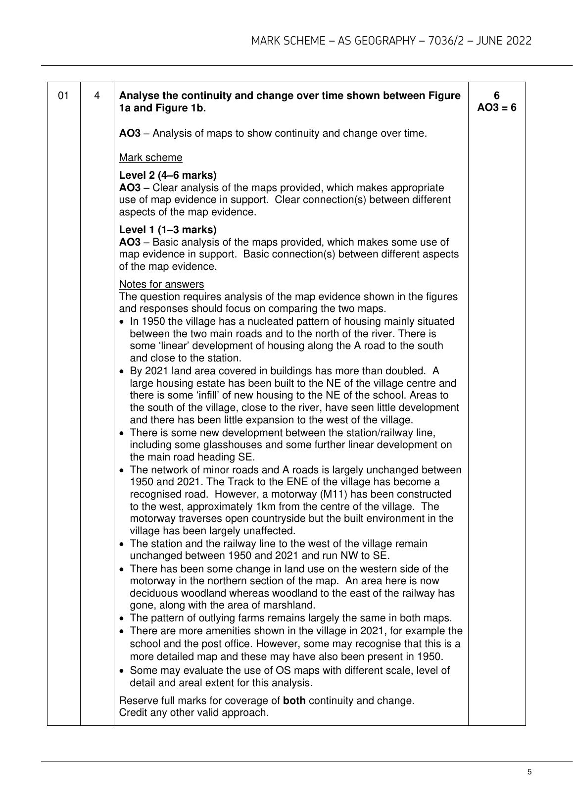AQA AS GEOGRAPHY PAPER 2 JUNE 2022 MARK SCHEME (7036/2: Human Geography and Geography Fieldwork Investigation)