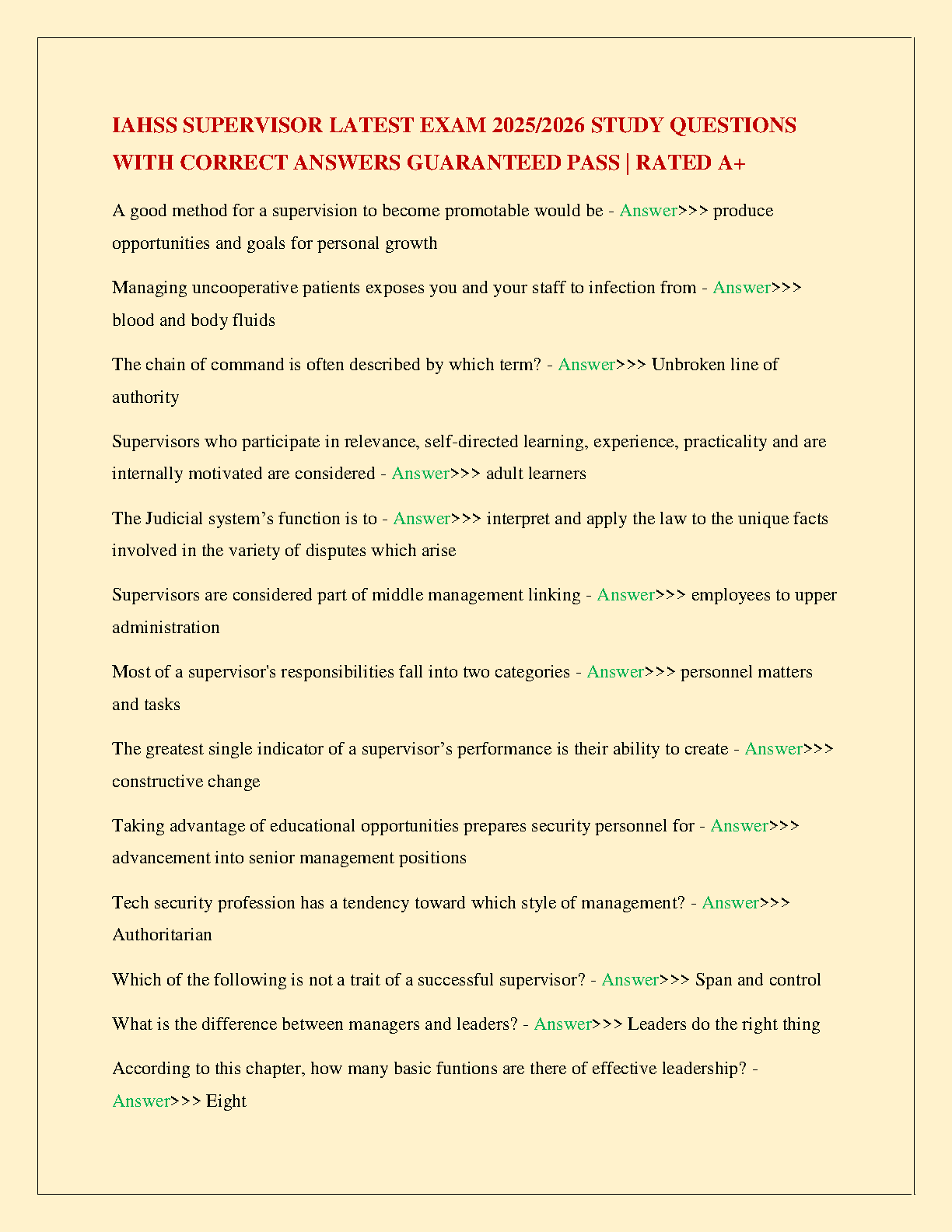 IAHSS Supervisor Exam 2025/2026 Study Questions with Correct Answers by [Author Name]
