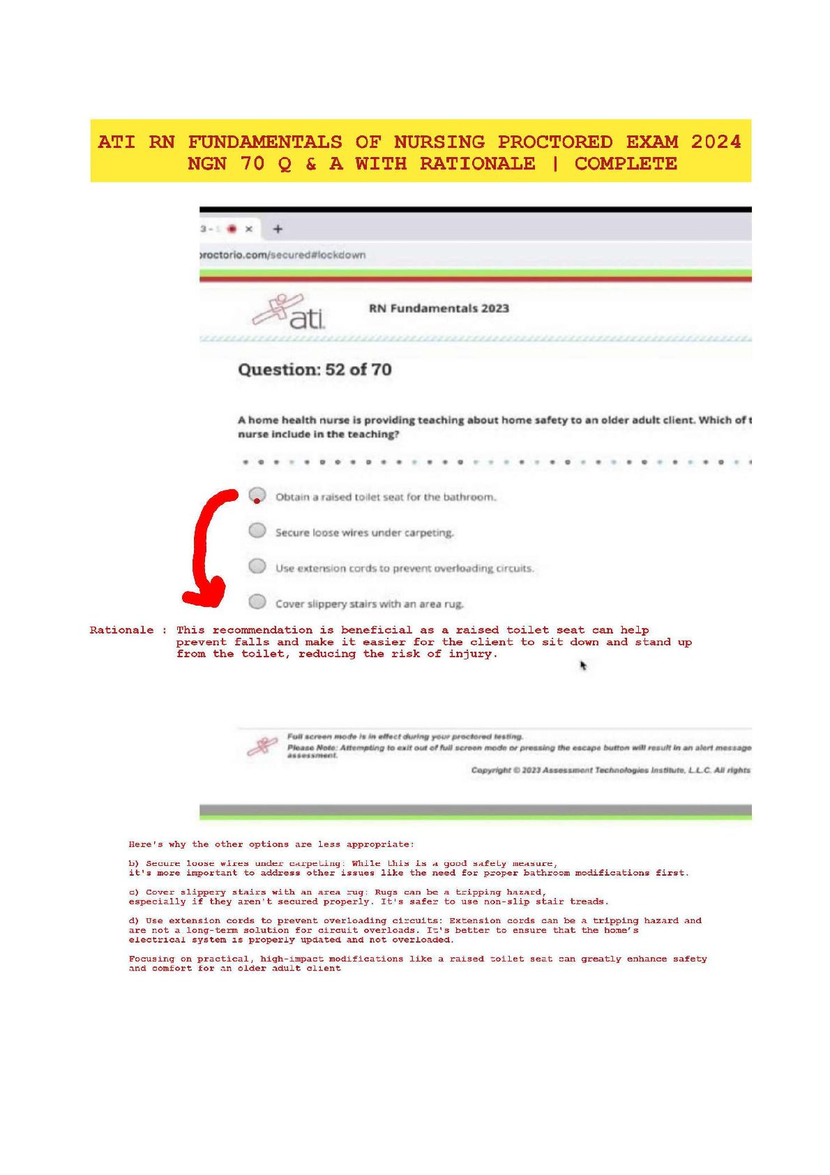 Ace your ATI RN Fundamentals of Nursing Proctored Exam in 2024 with this complete guide featuring 70 questions and answers with rationales. This comprehensive resource, developed by Assessment Technologies Institute, is designed to help nursing students pass their exams on the first attempt, avoiding costly resits. Prepare effectively and confidently.