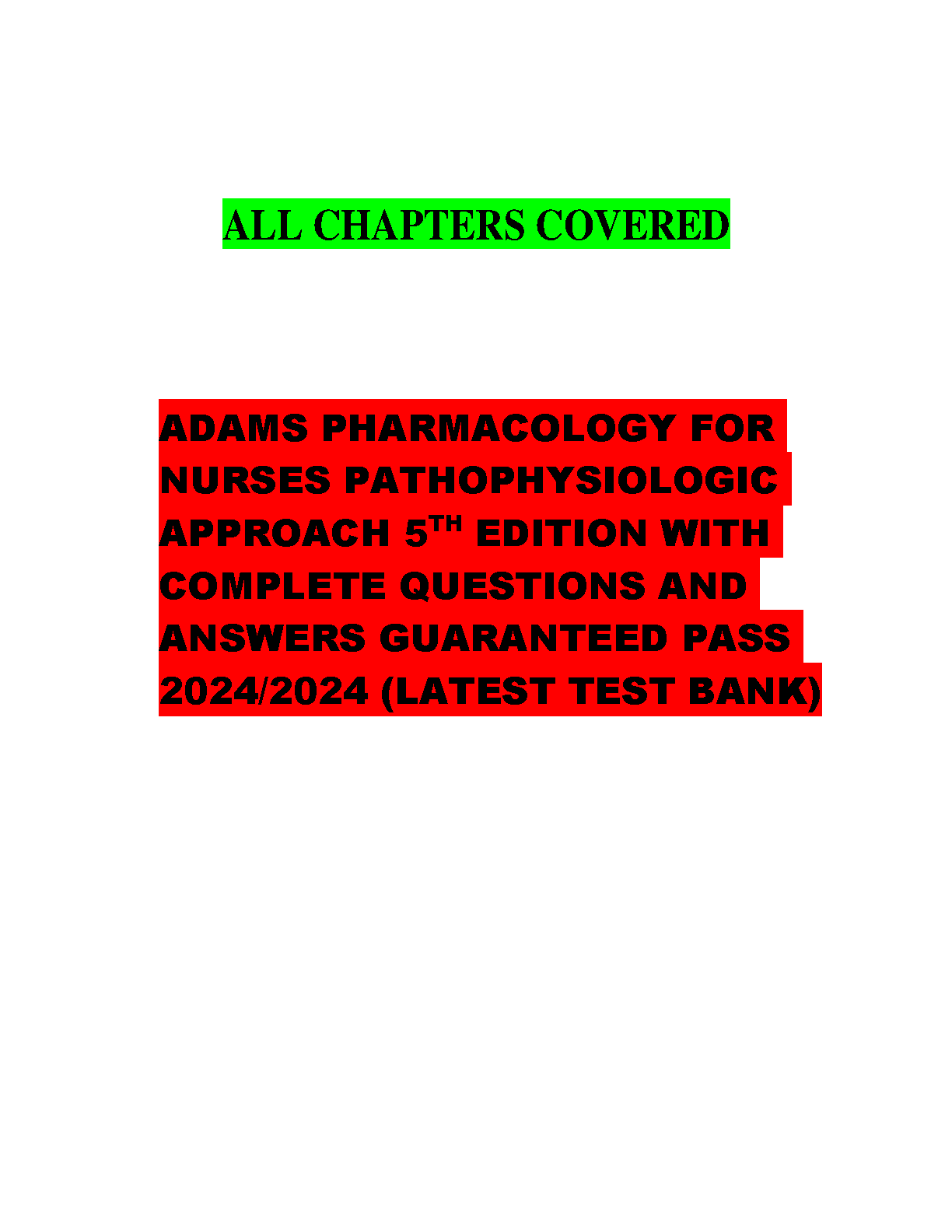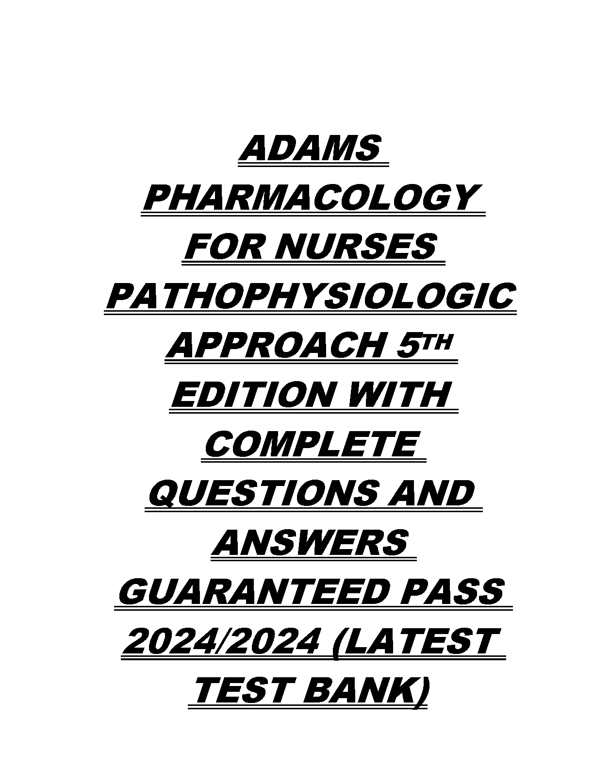 Ace your nursing pharmacology exams with this comprehensive test bank for Adams' Pharmacology for Nurses: A Pathophysiologic Approach, 5th Edition. This latest 2024/2025 resource includes complete questions and answers, designed to help you pass your exams on the first attempt and avoid resits. Prepare effectively and boost your confidence with this invaluable study tool.
