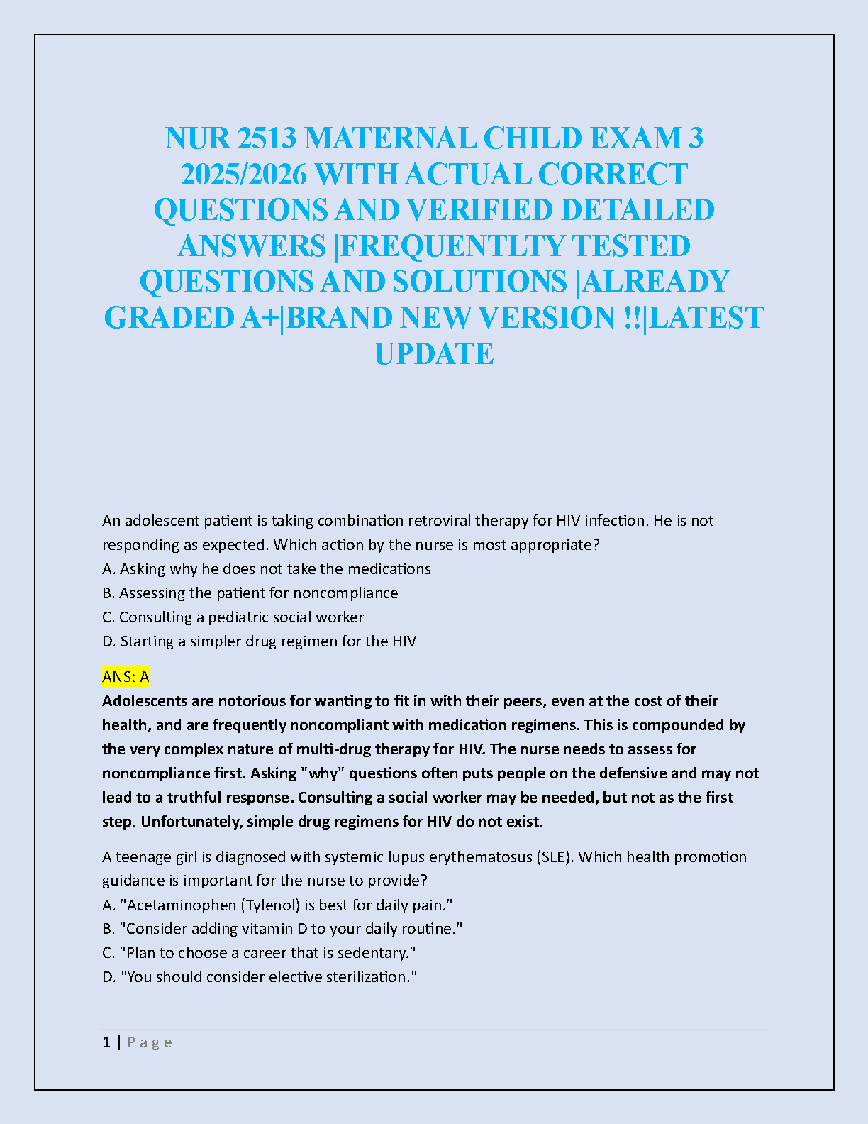 Ace your NUR 2513 Maternal Child Exam 3 with this comprehensive study guide. This 2025/2026 edition features actual exam questions, detailed answers, and solutions to frequently tested questions. This resource is already graded A+ and will help you avoid resits and pass on your first attempt. Updated with the latest information for optimal exam preparation.