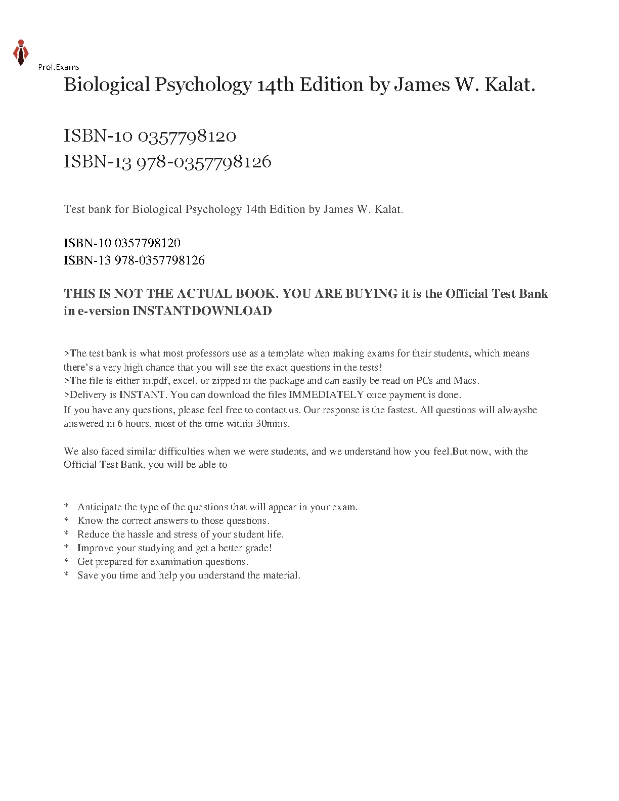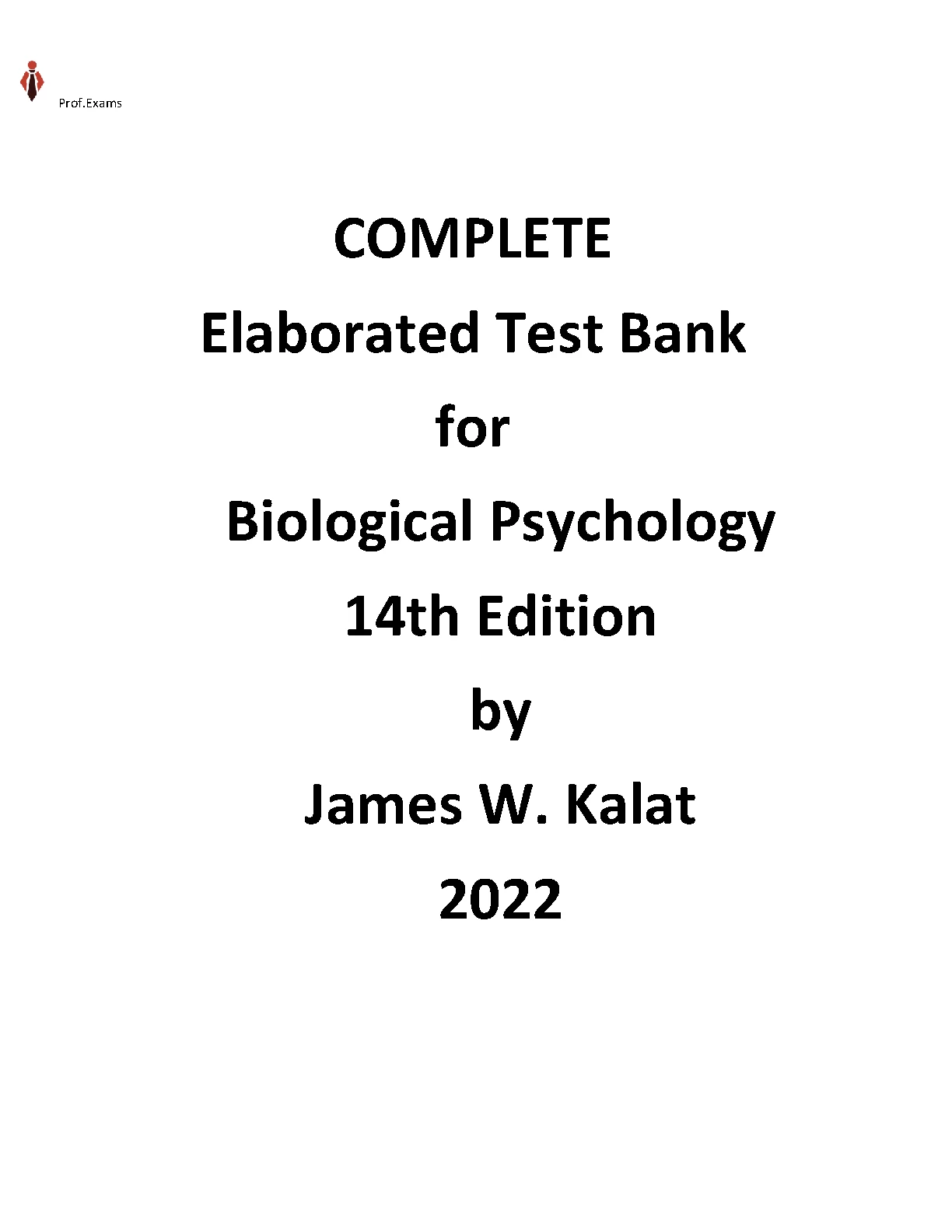 COMPLETE Elaborated Test Bank for Biological Psychology 14th Edition by James W. Kalat. DOWNLOAD on www.hackedexams.com INSTANTLY.