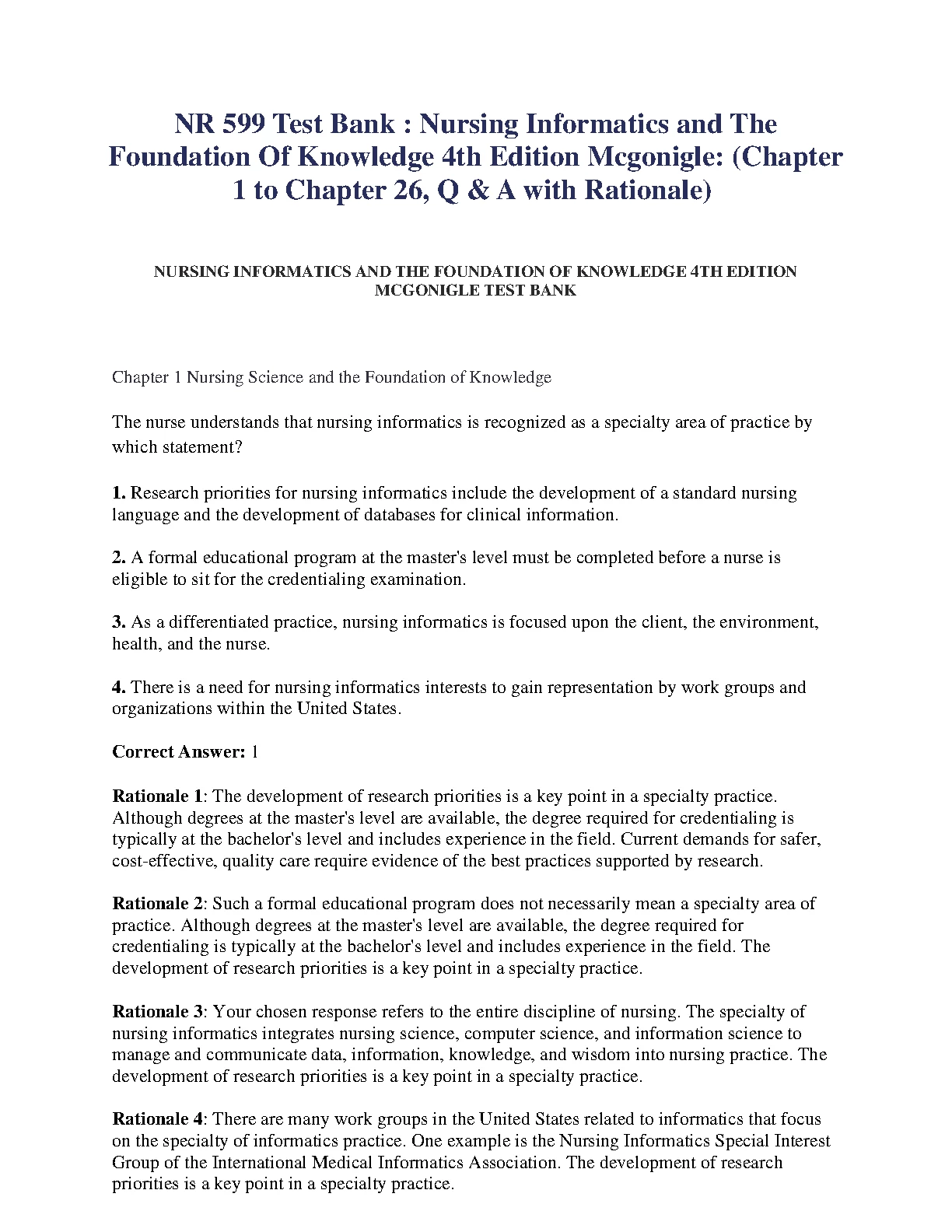 NR 599 Test Bank : Nursing Informatics and The Foundation Of Knowledge 4th Edition Mcgonigle: (Chapter 1 to Chapter 26, Q & A with Rationale)