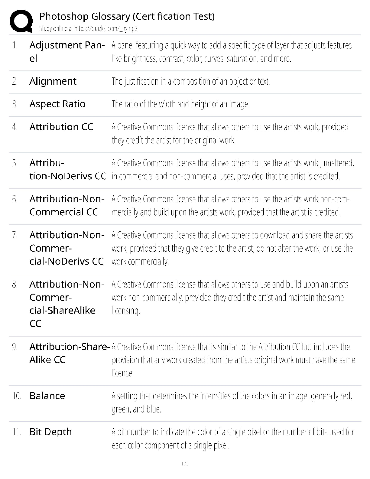 Master the fundamentals of Photoshop with this comprehensive glossary. Perfect for certification prep, this resource explains key terms like Adjustment Panel, Alignment, Aspect Ratio, and various Creative Commons licenses, ensuring exam success on your first try. Avoid resits and achieve mastery!