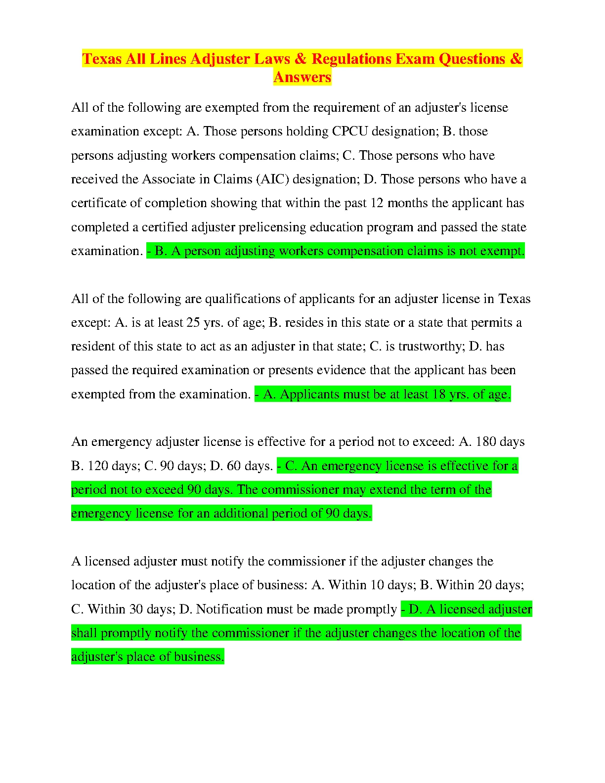 Texas All Lines Adjuster Laws & Regulations Exam Questions & Answers RATED A+. DOWNLOAD on www.hackedexams.com INSTANTLY.