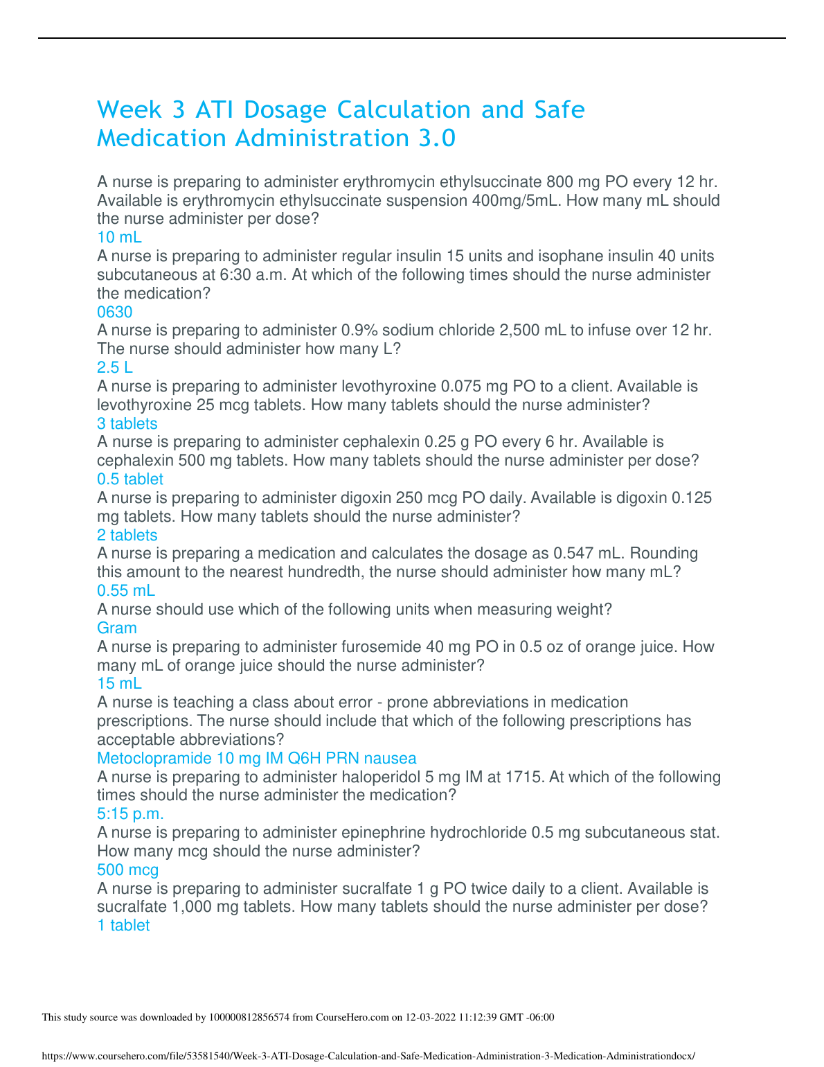 Week 3 ATI Dosage Calculation and Safe Medication Administration 3.0 COMPLETE STUDY GUIDE FOR 2023/2024