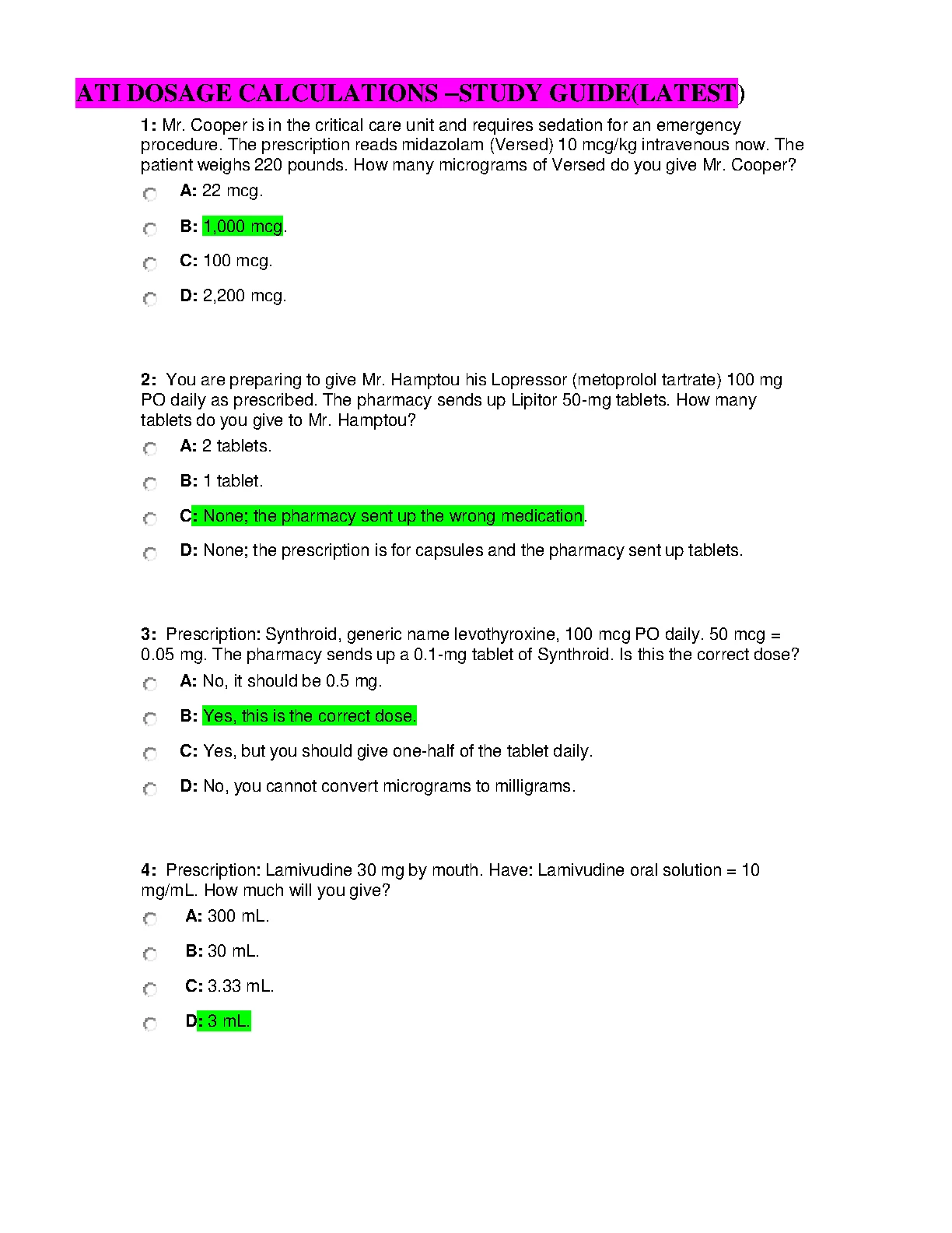 ATI DOSAGE CALCULATIONS –STUDY GUIDE(LATEST UPDATE). DOWNLOAD INSTANTLY on www.hackedexams.com