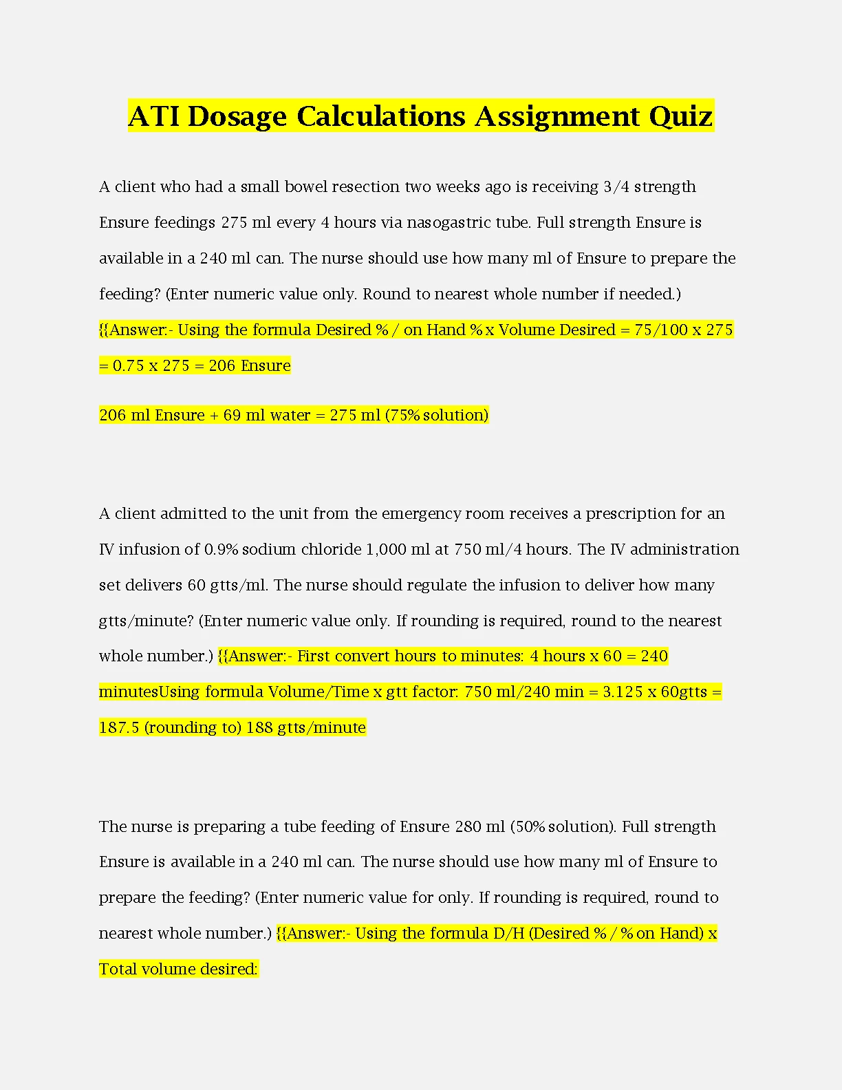 ATI Dosage Calculations Assignment Quiz COMPLETE AND 100% CORRECT