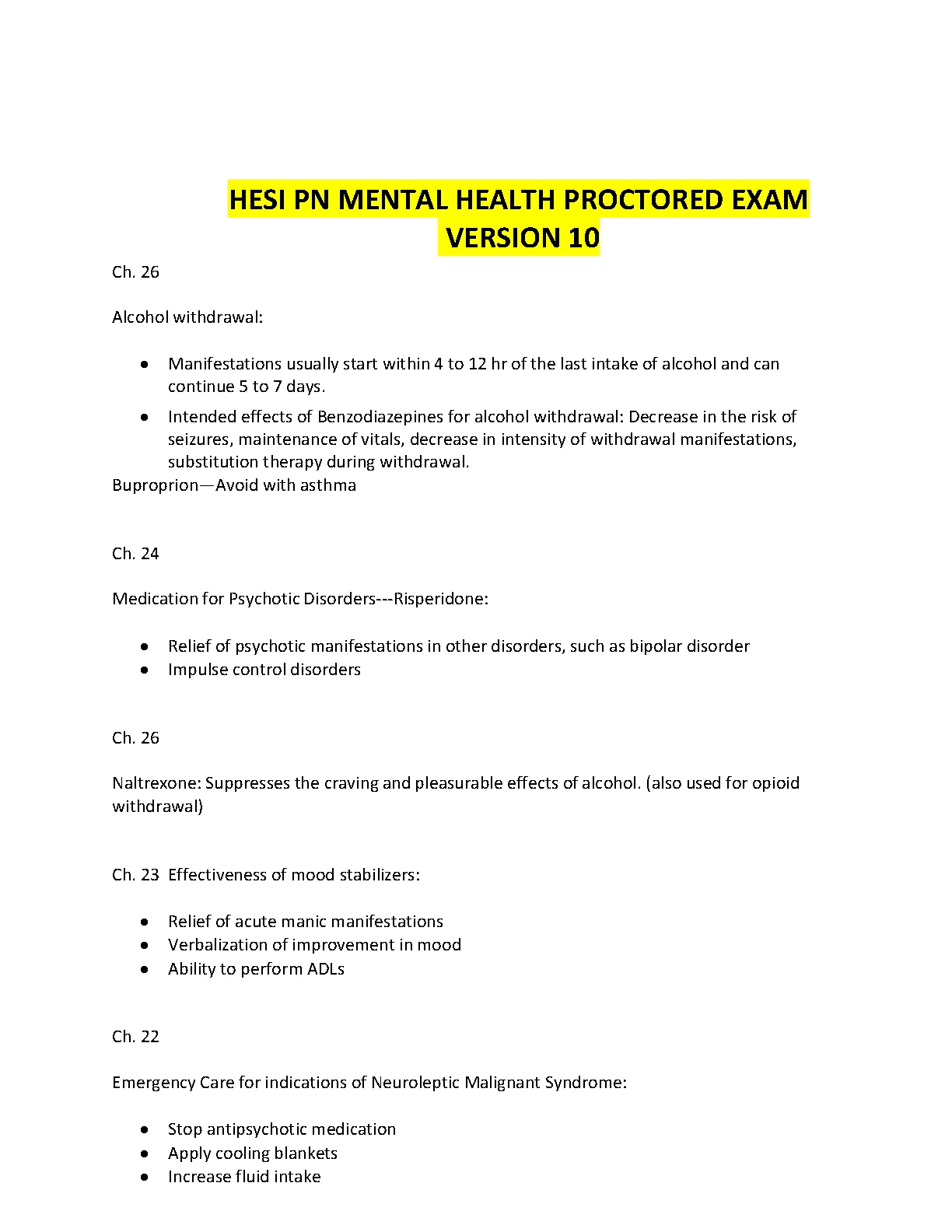 HESI PN MENTAL HEALTH PROCTORED EXAM VERSION 10 100% APPROVED