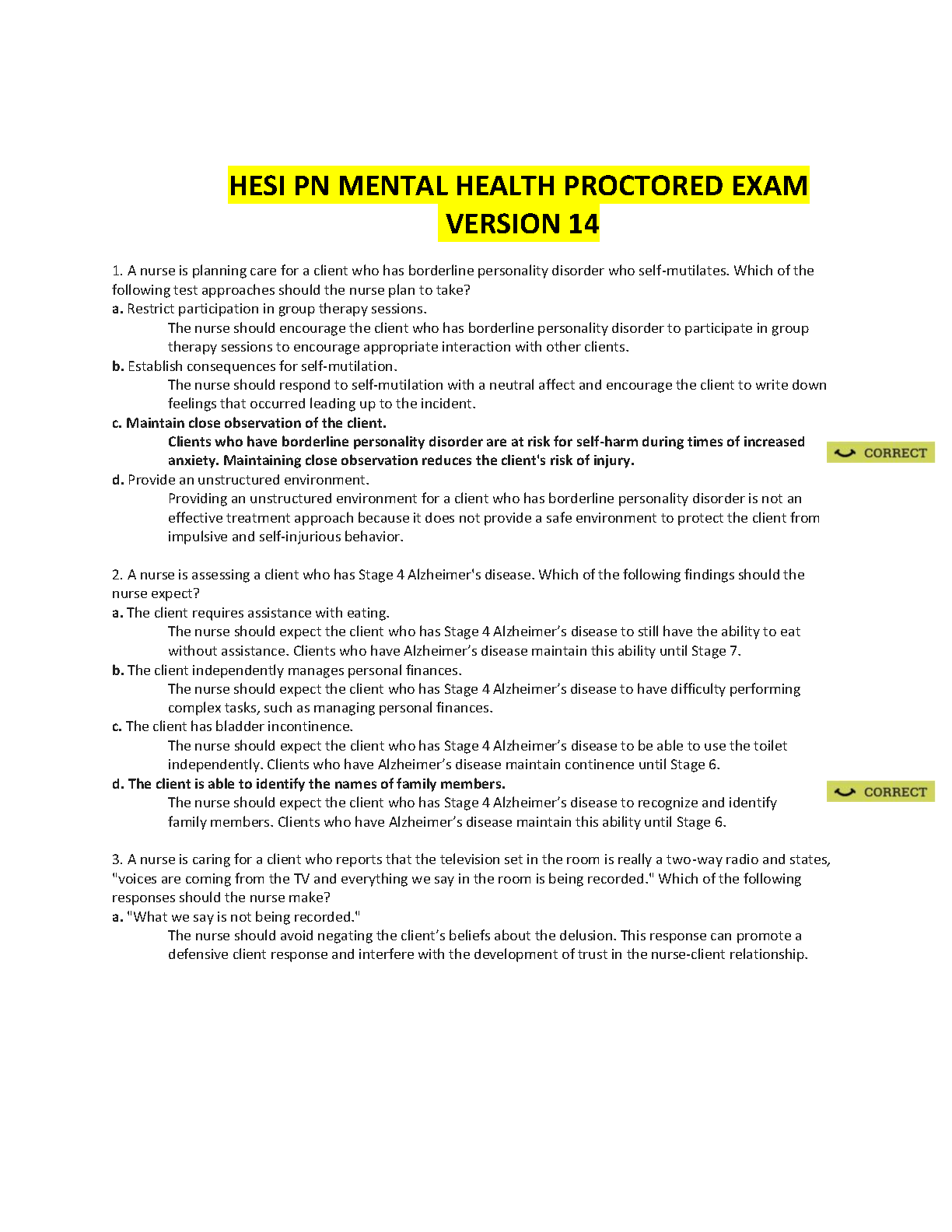 HESI PN MENTAL HEALTH PROCTORED EXAM VERSION 14 NEW SOLUTION FOR 2023