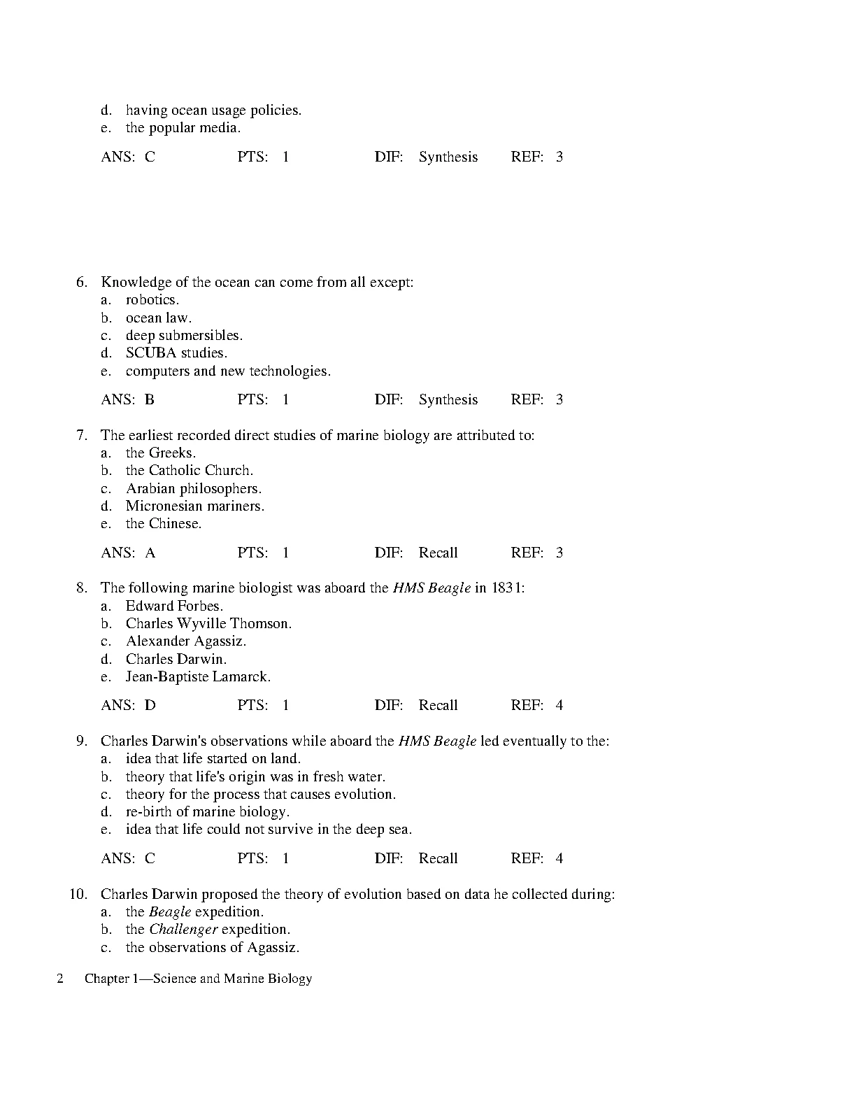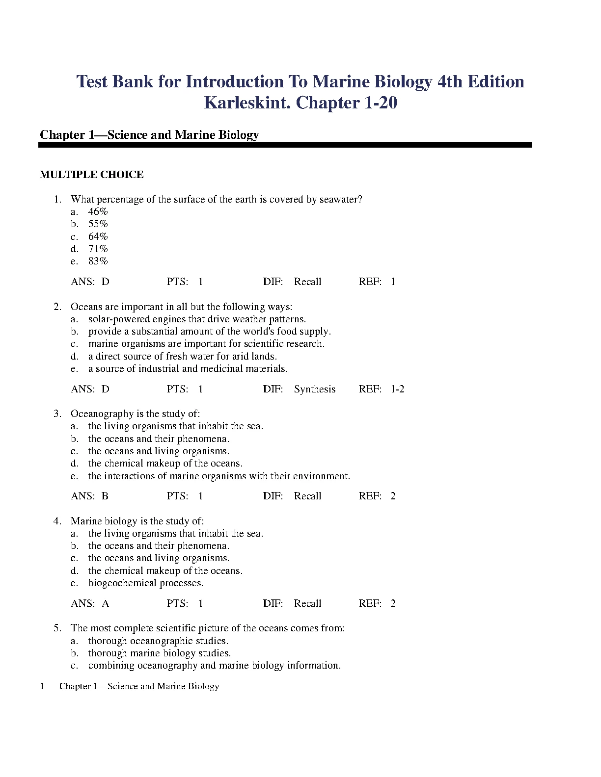 Test Bank for Introduction To Marine Biology 4th Edition BY Karleskint. Chapter 1-20.