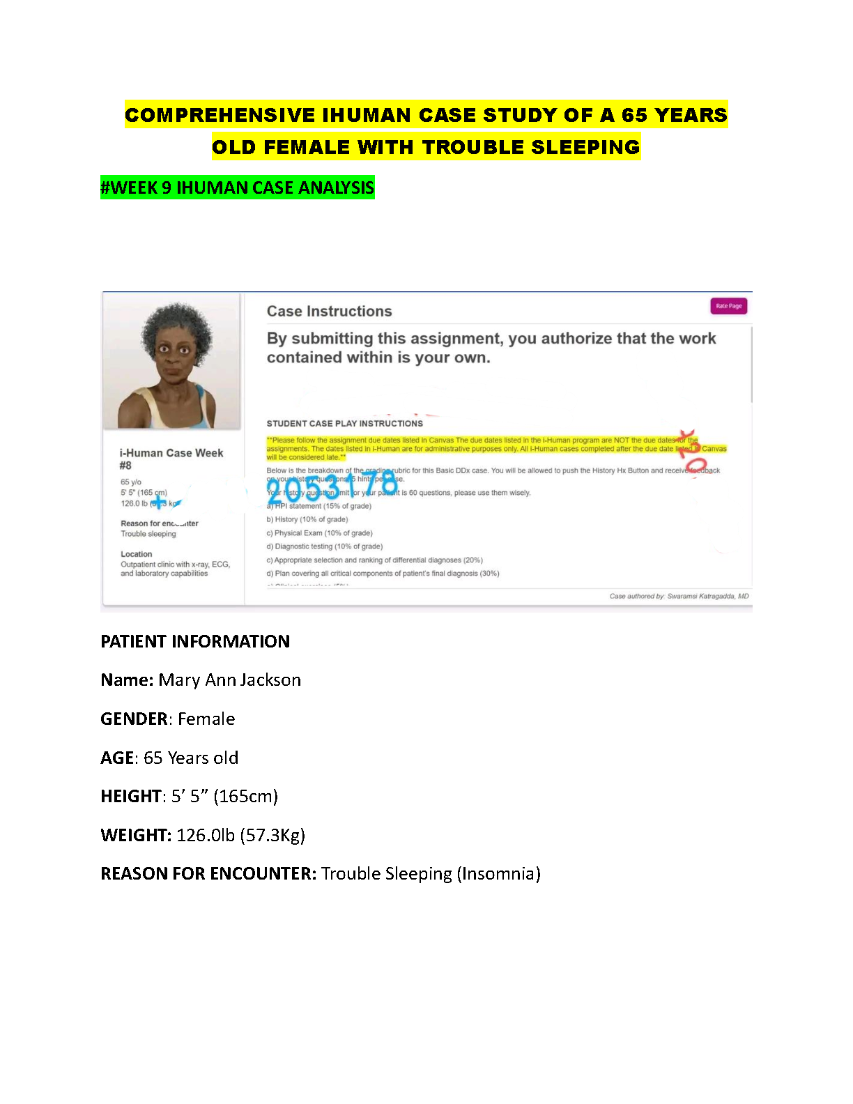 Master the art of diagnosing insomnia with this in-depth iHuman case study. Perfect for nursing students, this detailed analysis of a 65-year-old female patient's sleep problems will help you ace your exams on the first attempt and avoid resits. Learn to identify key symptoms, select appropriate diagnostic tests, and develop effective treatment plans. Prepare for success!