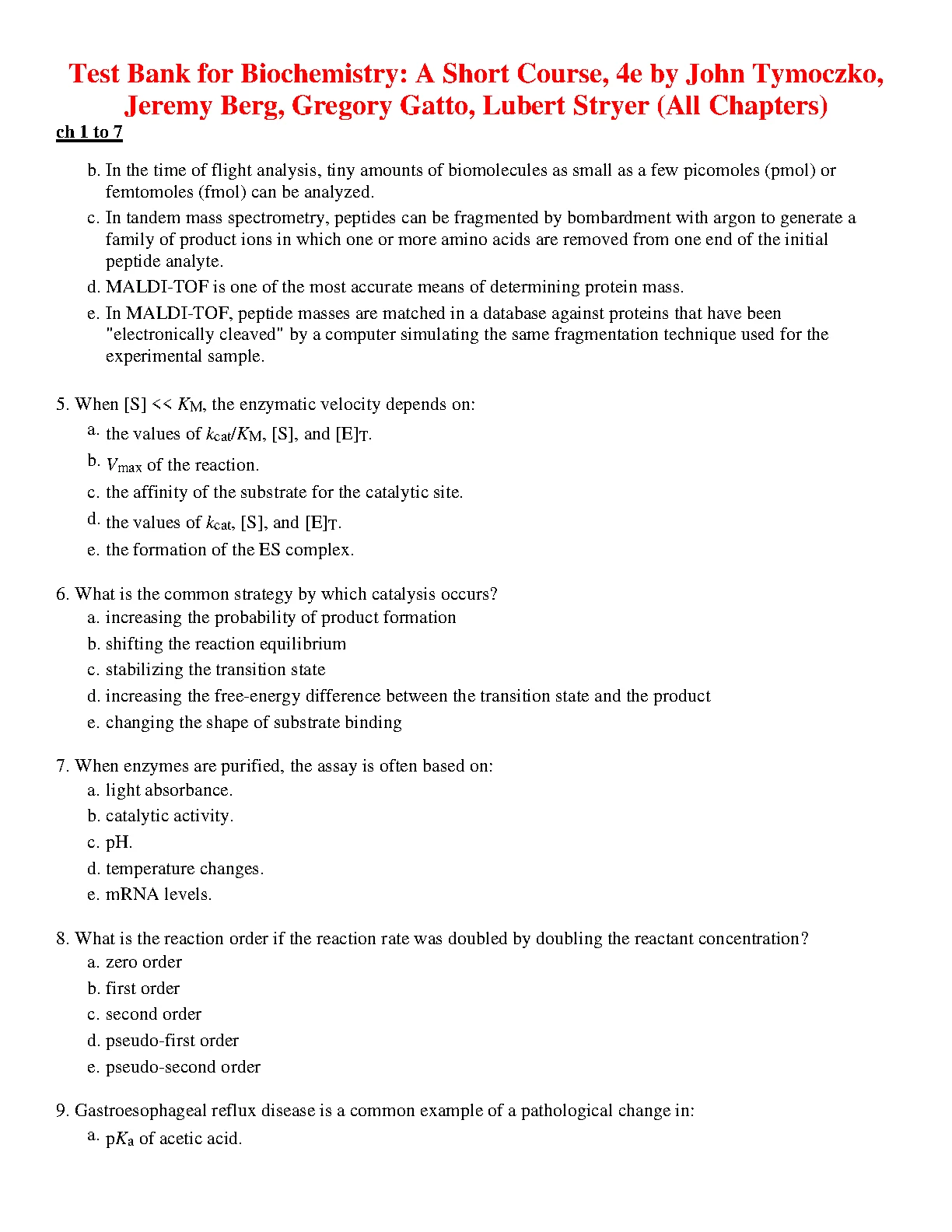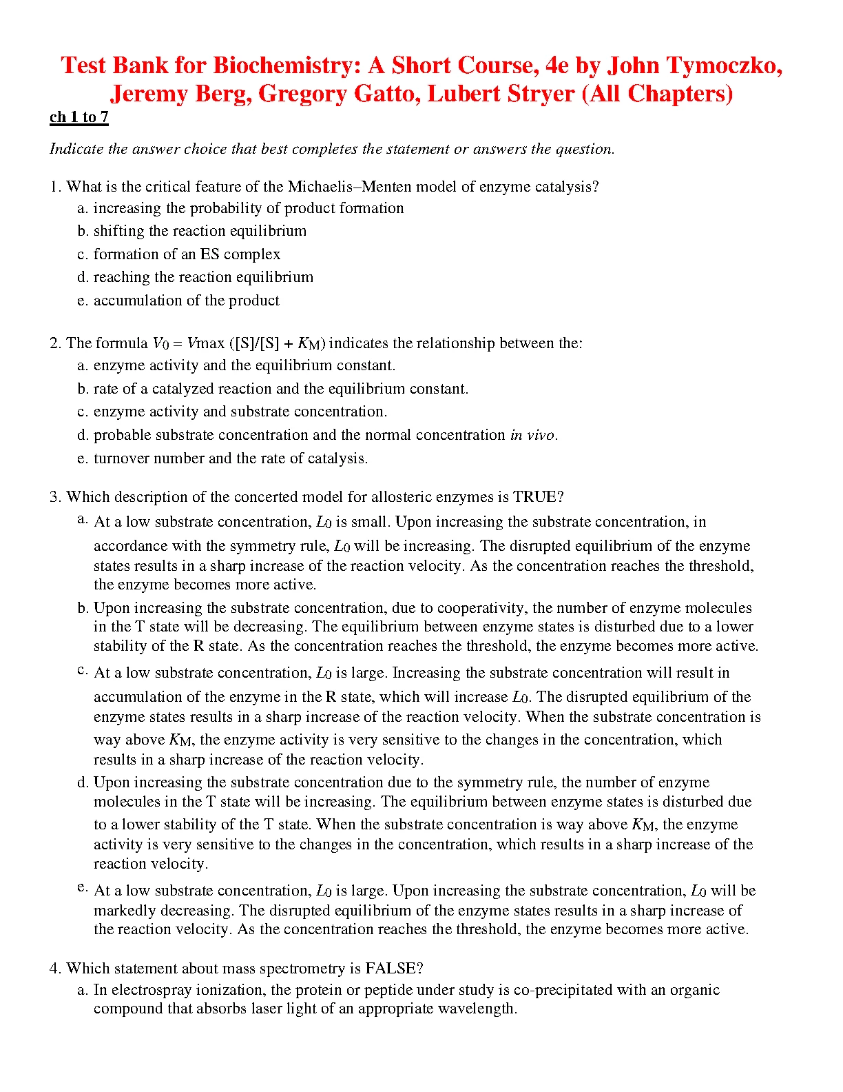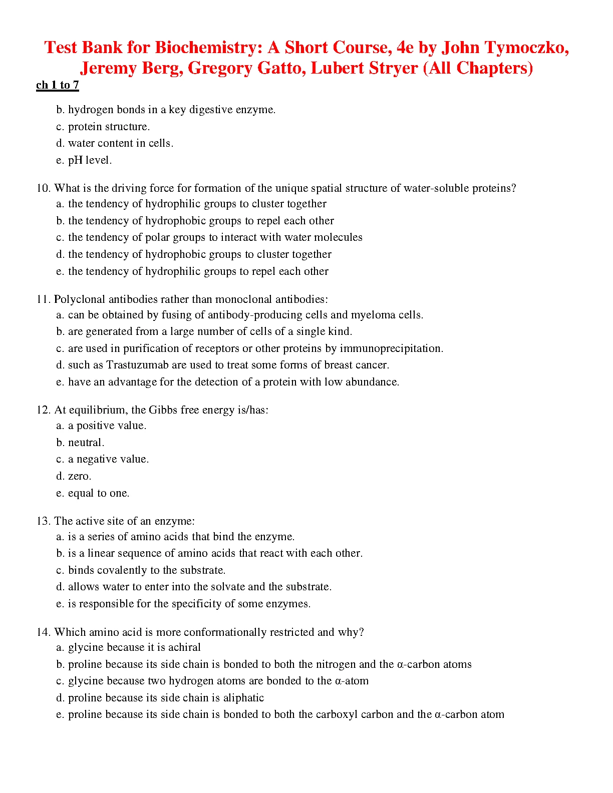 Test Bank for Biochemistry: A Short Course, 4TH EDITION by John Tymoczko, Jeremy Berg, Gregory Gatto, Lubert Stryer (All Chapters)