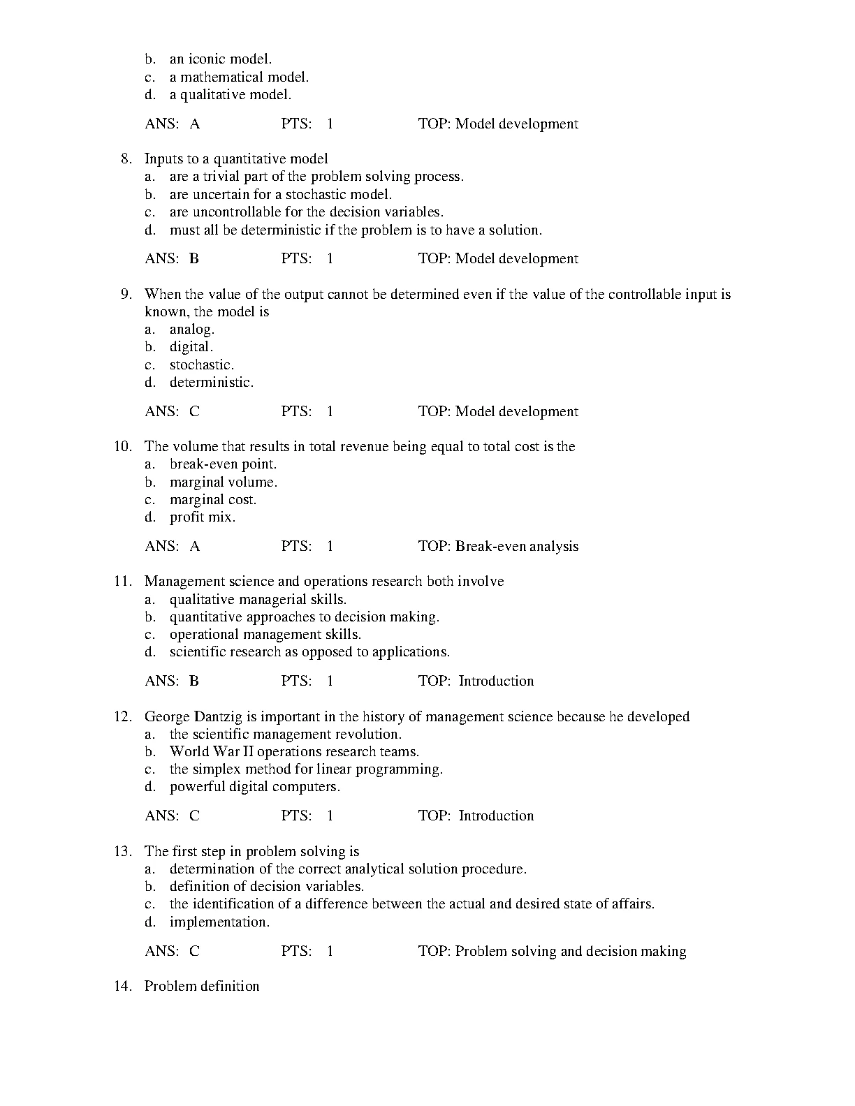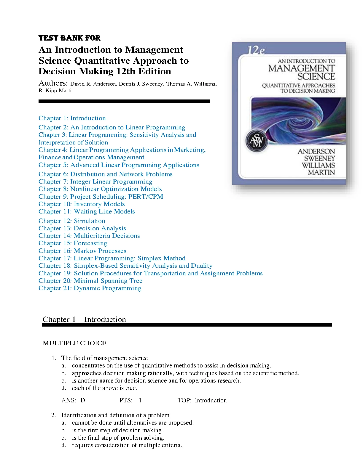 Test Bank for An Introduction to Management Science Quantitative Approach to Decision Making 12th Edition Authors: David R. Anderson, Dennis J. Sweeney, Thomas A. Williams, R. Kipp Marti