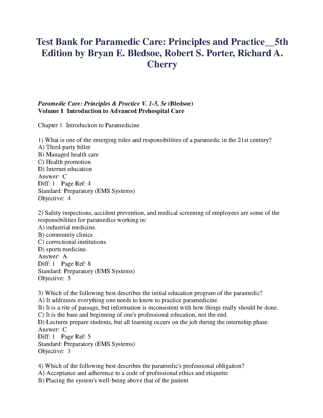 Test Bank for Paramedic Care: Principles and Practice 5th Edition by Bryan E. Bledsoe, Robert S. Porter, Richard A. Cherry
