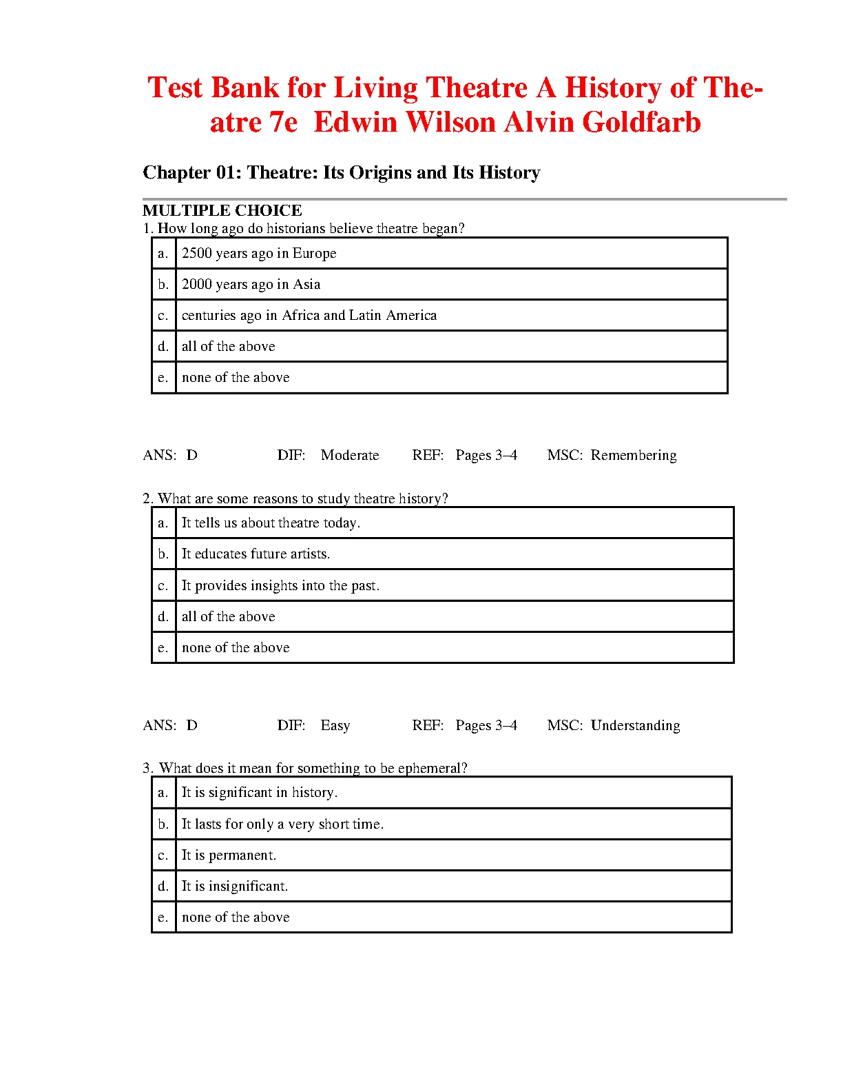 Test Bank for Living Theatre A History of Theatre 7TH EDITION BY Edwin Wilson Alvin Goldfarb. DOWNLOAD on www.hackedexams.com INSTANTLY.