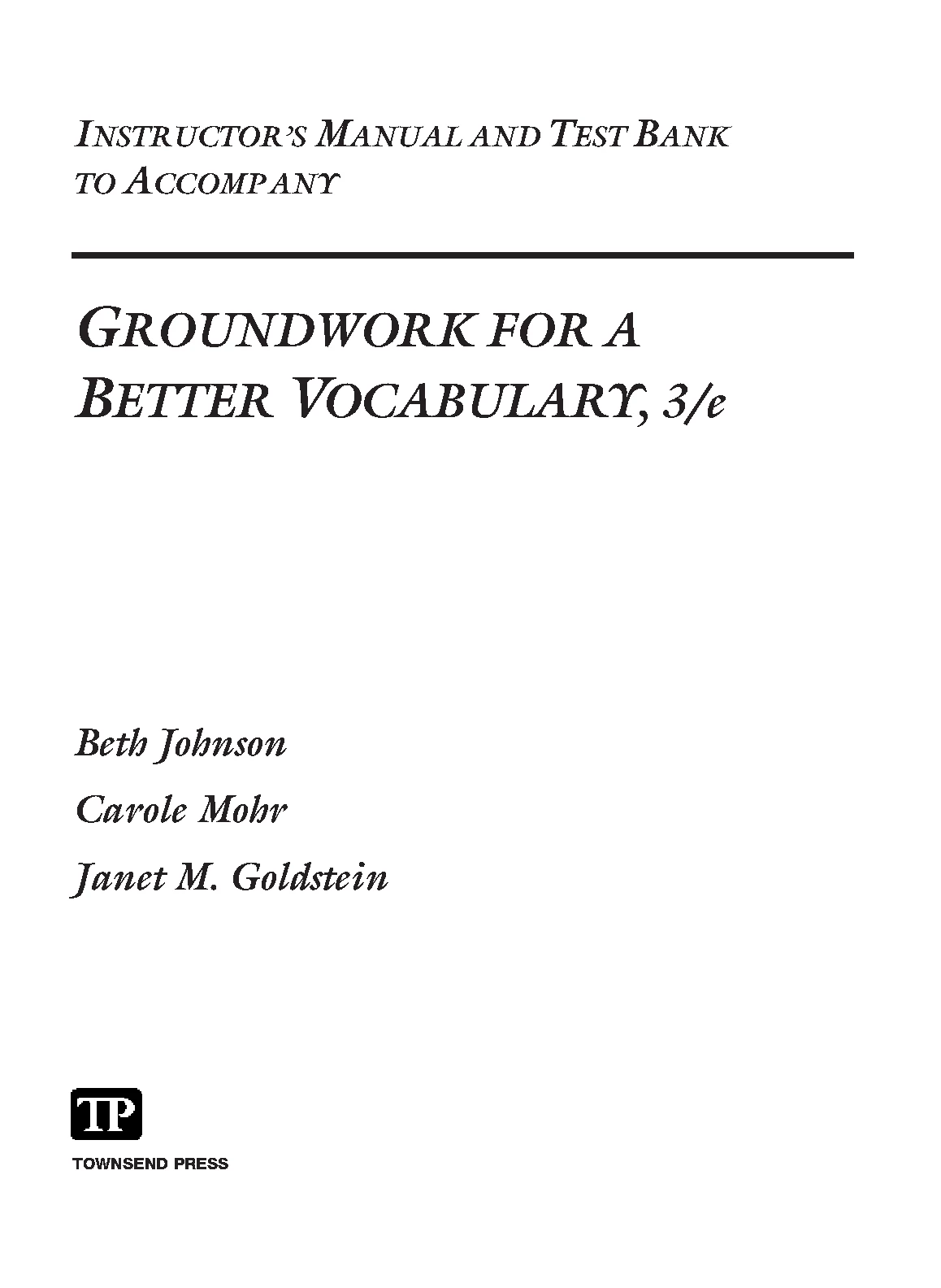 Instructor’s Manual and Test Bank to Accompany: Groundwork for a Better Vocabulary, 3RD EDITION BY Beth Johnson Carole Mohr Janet M. Goldstein TOWNSEND PRESS