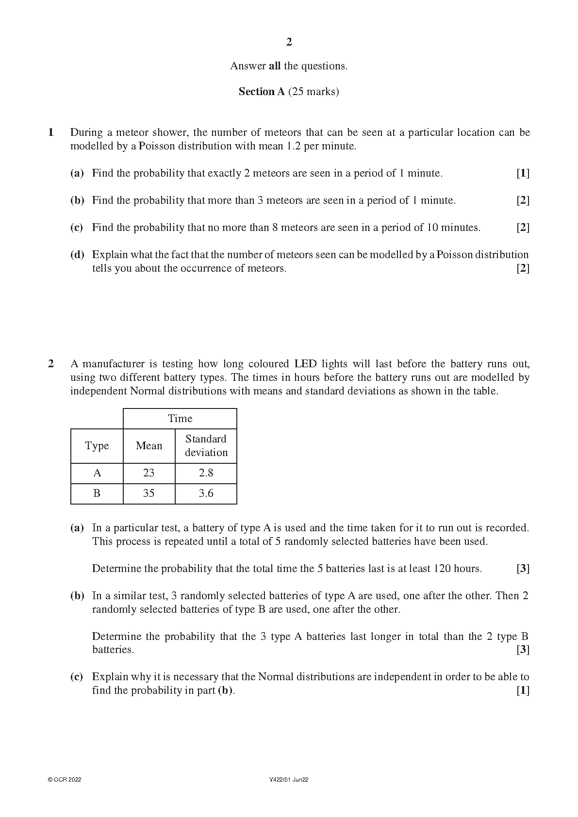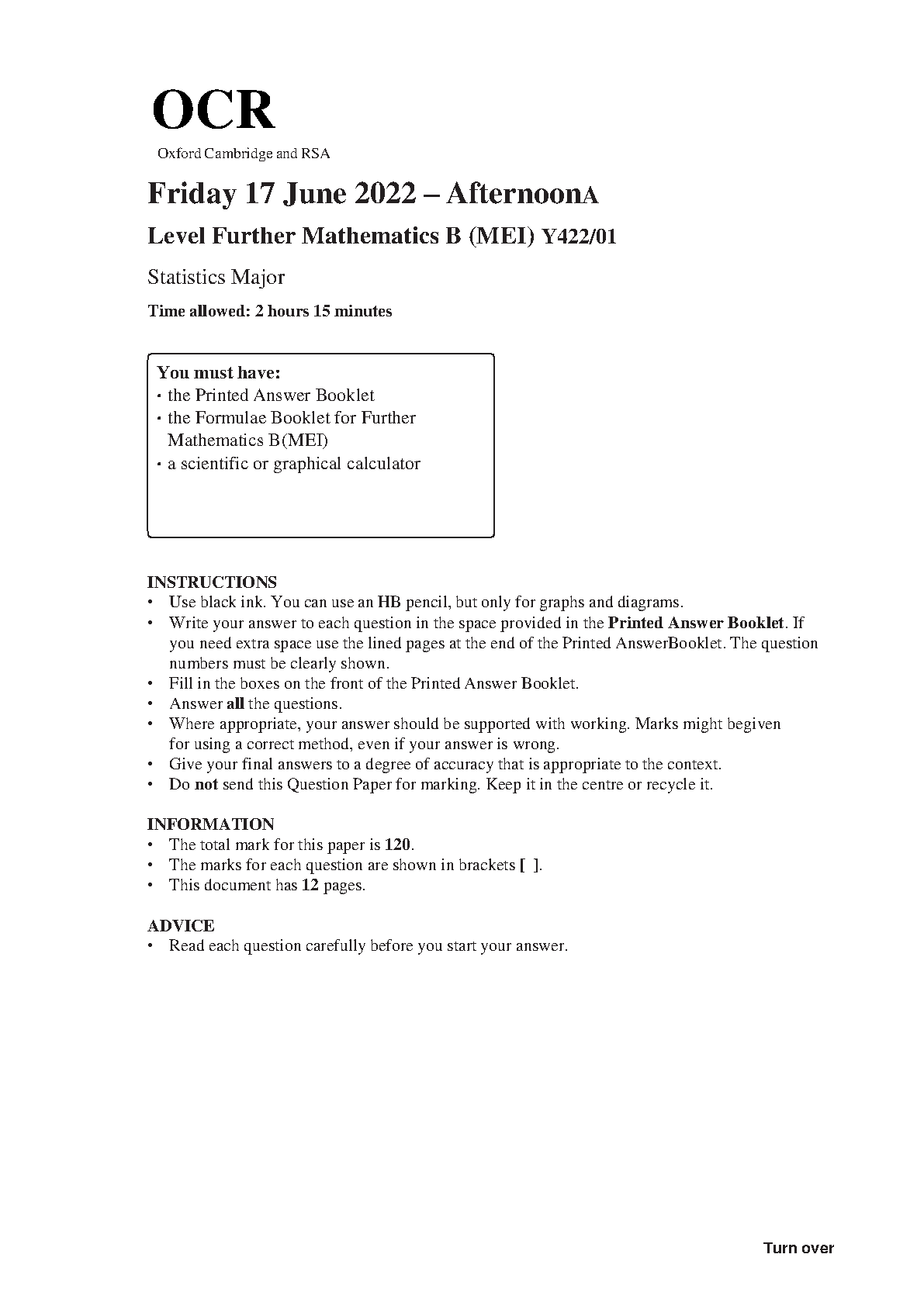 OCR A LEVEL FURTHER MATHEMATICS B PAPER 1 JUNE 2022 QUESTION PAPER (Y422/01: Statistics Major)