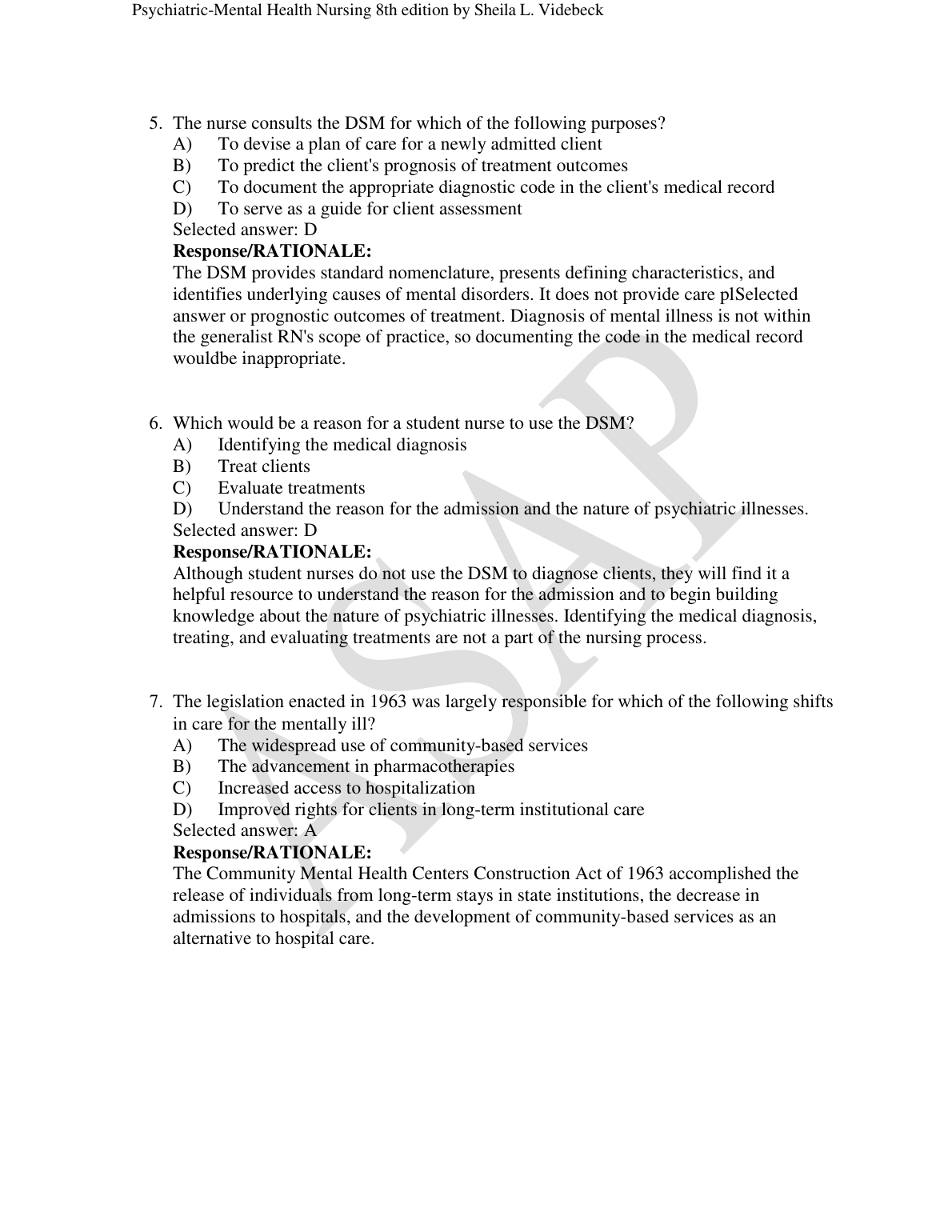 TEST BANK FOR Psychiatric-Mental Health Nursing 8th edition by Sheila L. Videbeck UPDATED ALL CHAPTERS. DOWNLOAD on www.hackedexams.com INSTANTLY.