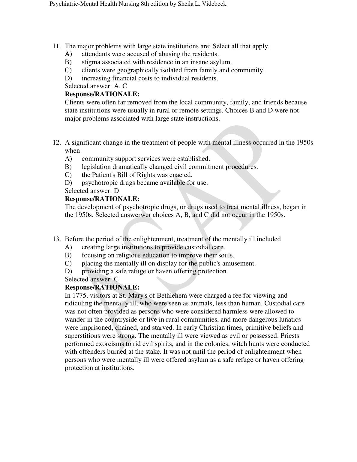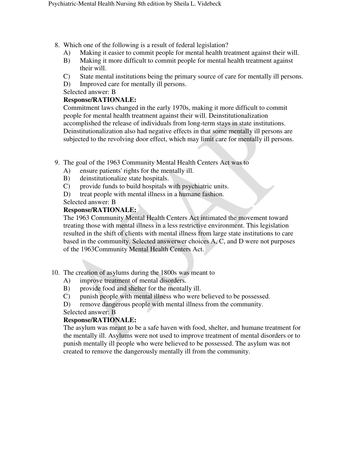 TEST BANK FOR Psychiatric-Mental Health Nursing 8th edition by Sheila L. Videbeck UPDATED ALL CHAPTERS