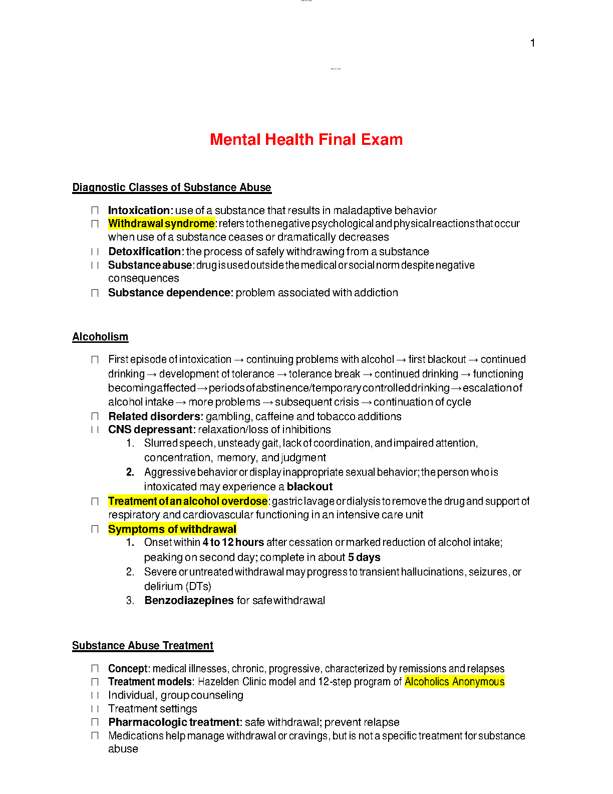 Ace your Mental Health Final Exam with this comprehensive study guide focusing on substance abuse. This resource covers key diagnostic classes, alcoholism, treatment, and withdrawal symptoms. Designed to help you pass your exam on the first try and avoid resits. Ideal for 2024/2025 academic year.