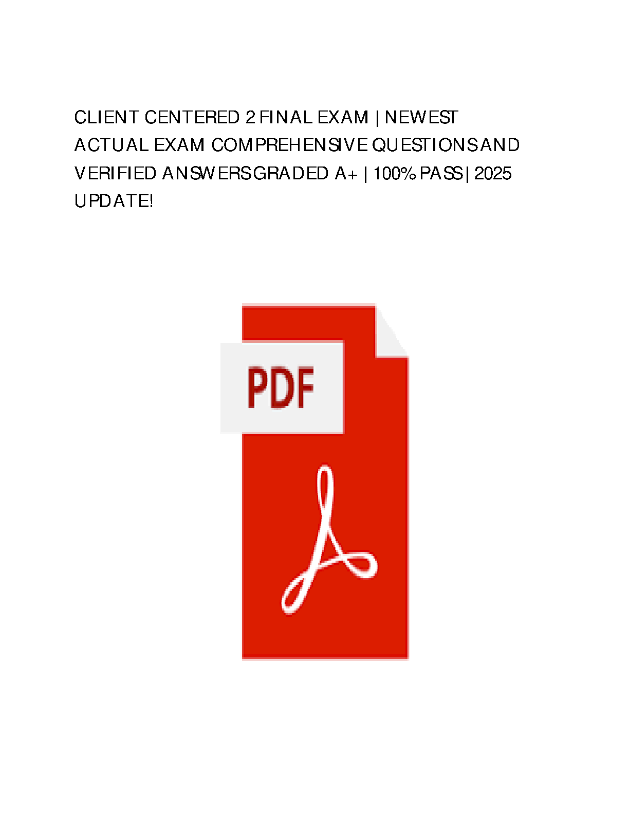 Ace your Client Centered 2 final exam with this comprehensive study resource! This updated 2024-2025 edition contains actual exam questions and verified answers, guaranteeing a high score and first-attempt success. Avoid resits and boost your confidence with this essential exam prep guide.