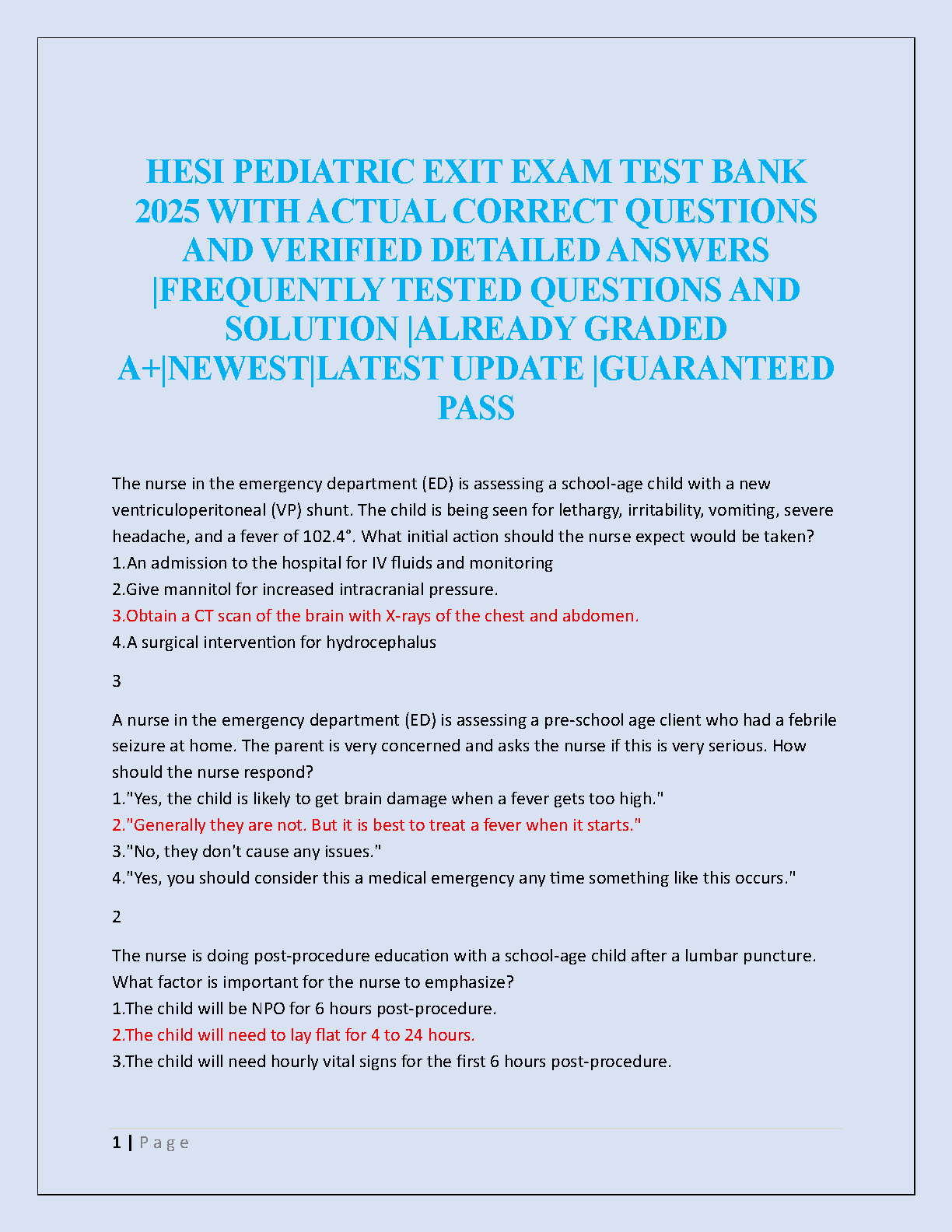 Ace your HESI Pediatric Exit Exam with our 2025 edition test bank. This resource features actual correct questions, verified detailed answers, and frequently tested questions, all already graded. Guaranteed to help you pass on your first try and avoid resits. Get the newest and latest updates for exam success!