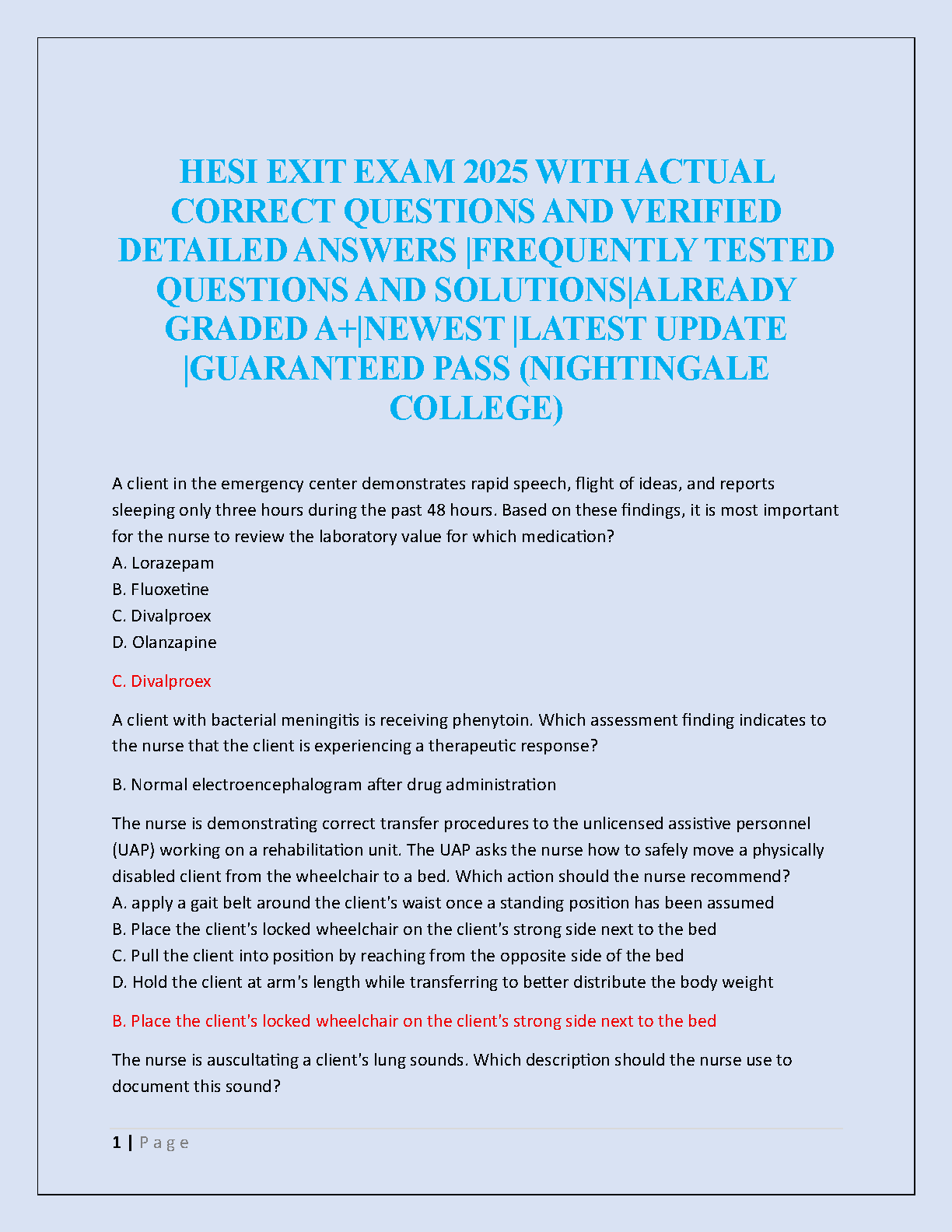 HESI Exit Exam 2025: Guaranteed A+ Pass with Actual Questions and Verified Answers (Nightingale College)