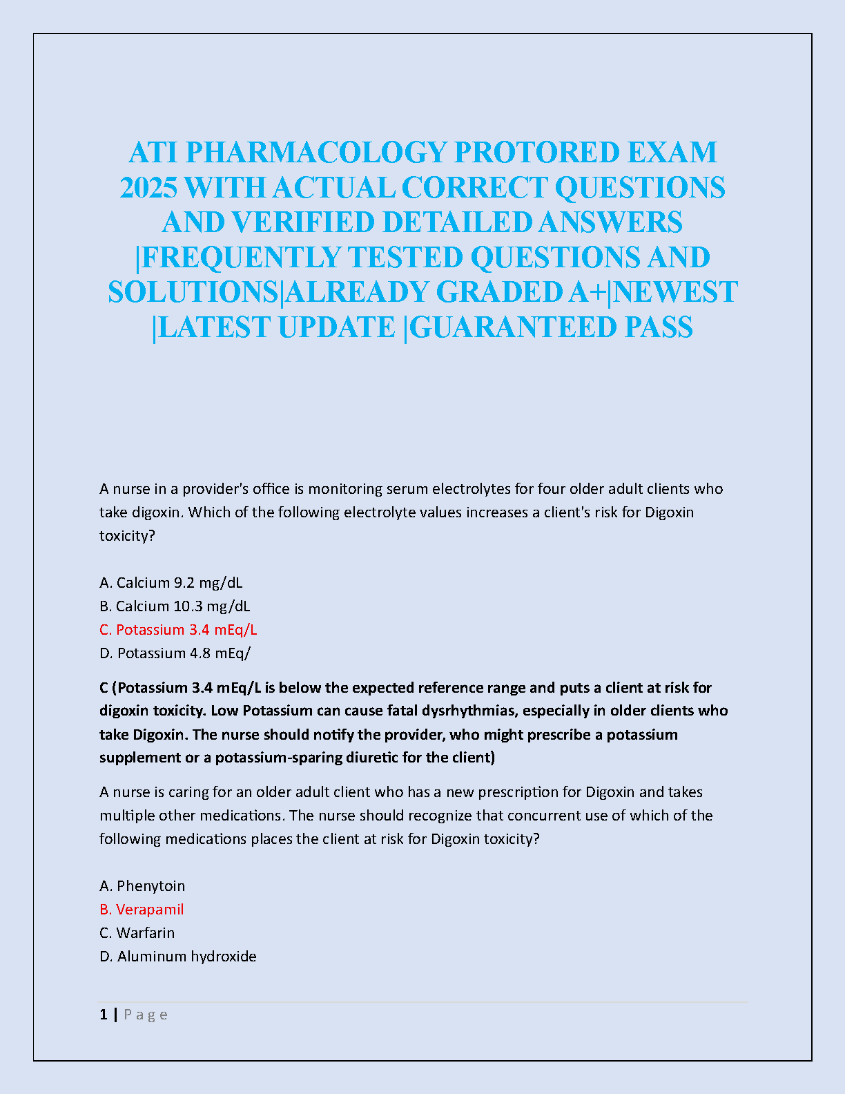 Ace your ATI Pharmacology Proctored Exam in 2025 with this comprehensive study guide. This resource includes actual correct questions and verified detailed answers, frequently tested questions and solutions, all already graded A+. The latest update ensures you're prepared for the exam and get a guaranteed pass, avoiding resits. Prepare for success on your first attempt!