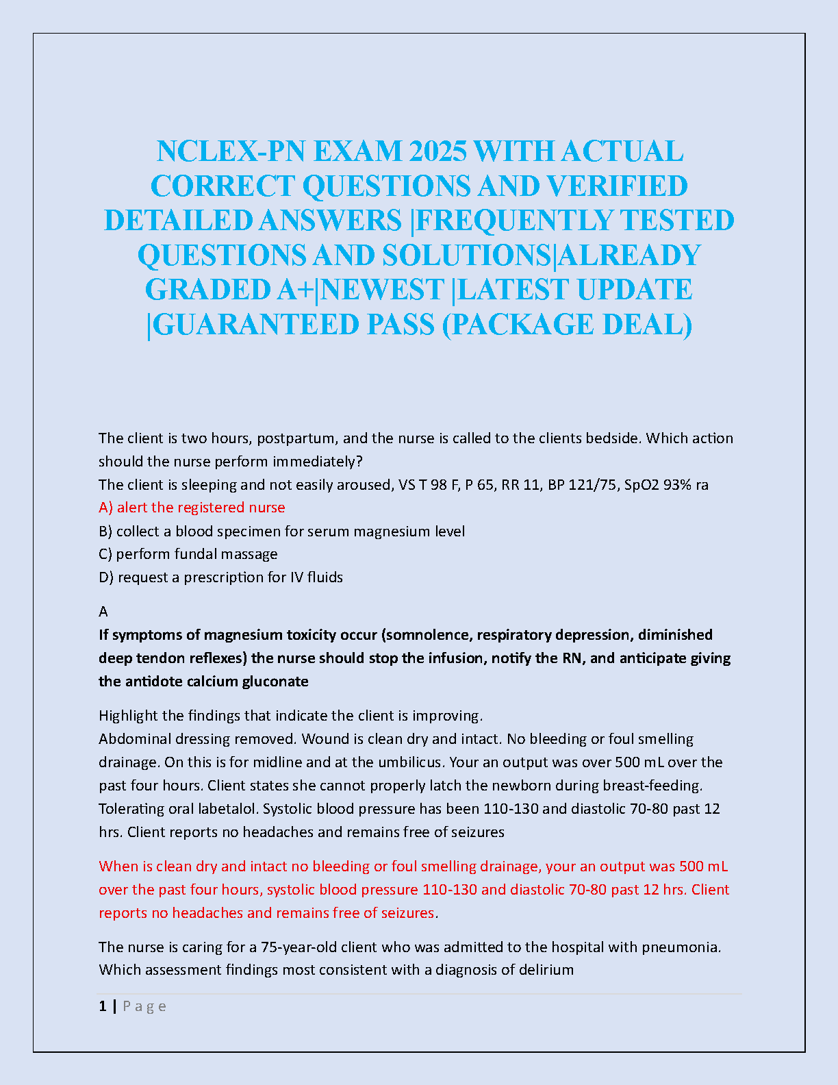 Ace your NCLEX-PN exam in 2025 with this comprehensive package. This resource contains actual, verified questions and detailed answers, frequently tested questions and solutions, all graded A+. The latest update ensures you're prepared for the exam's most recent trends. Avoid resits and pass on your first attempt!
