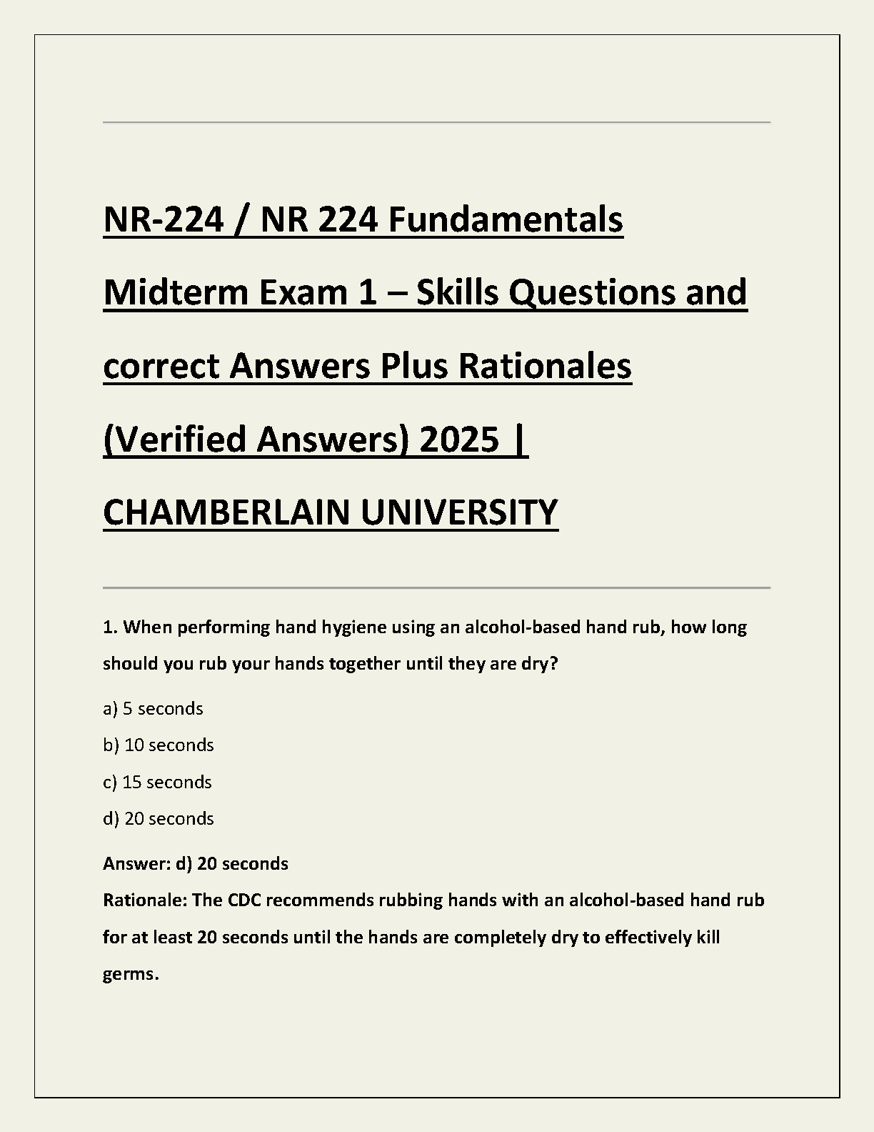 Ace your Chamberlain University NR-224/NR 224 Fundamentals Midterm Exam 1 (2025 edition) with this comprehensive guide. This resource provides verified answers and rationales for skills-based questions, ensuring first-attempt exam success and avoiding resits. Get exam-ready and boost your confidence!