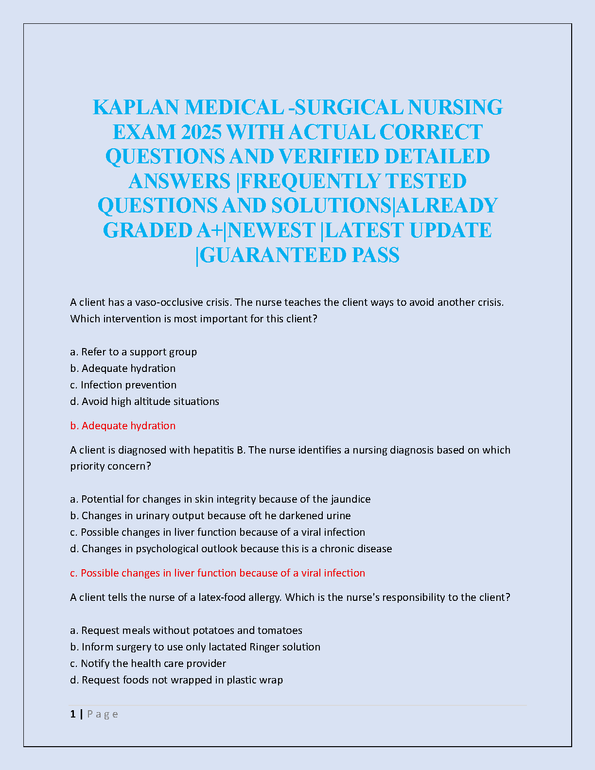 Ace the Kaplan Medical-Surgical Nursing Exam 2025 with this comprehensive resource. Featuring actual, verified questions and detailed answers, this study guide is designed to help you avoid resits and pass your exam on the first attempt. This updated guide includes frequently tested questions and solutions, graded A+, ensuring you're prepared for the latest exam content. Guaranteed to help you pass!