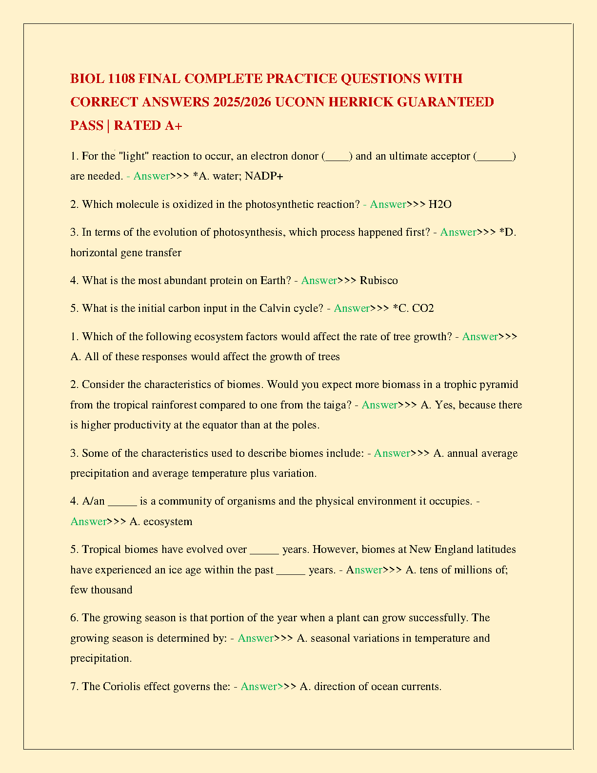 Ace your BIOL 1108 final exam with this comprehensive set of practice questions and answers, specifically designed for the 2025/2026 academic year at UConn with Professor Herrick. Guaranteed to help you pass on your first attempt. Includes detailed explanations for every question.