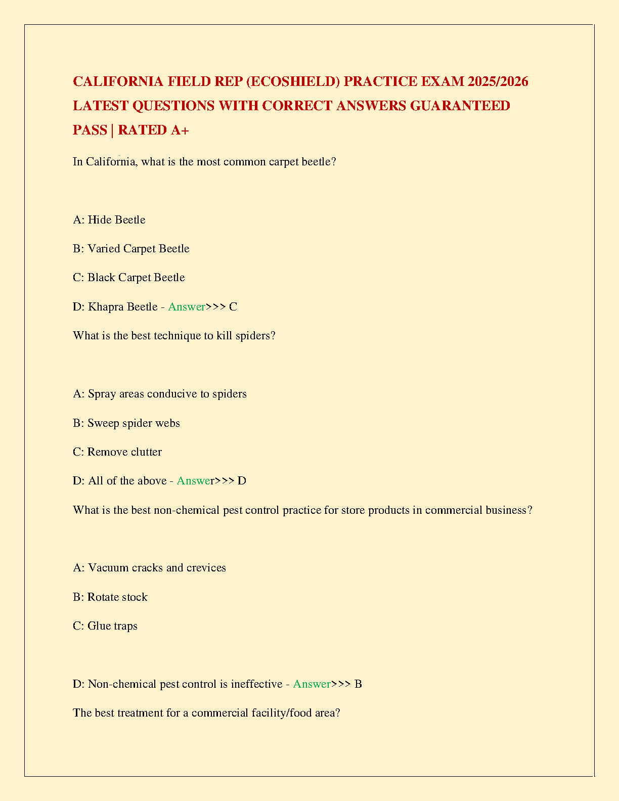 2025/2026 California Field Rep (Ecoshield) Practice Exam: Latest Questions with Correct Answers Guaranteed for A+ Pass