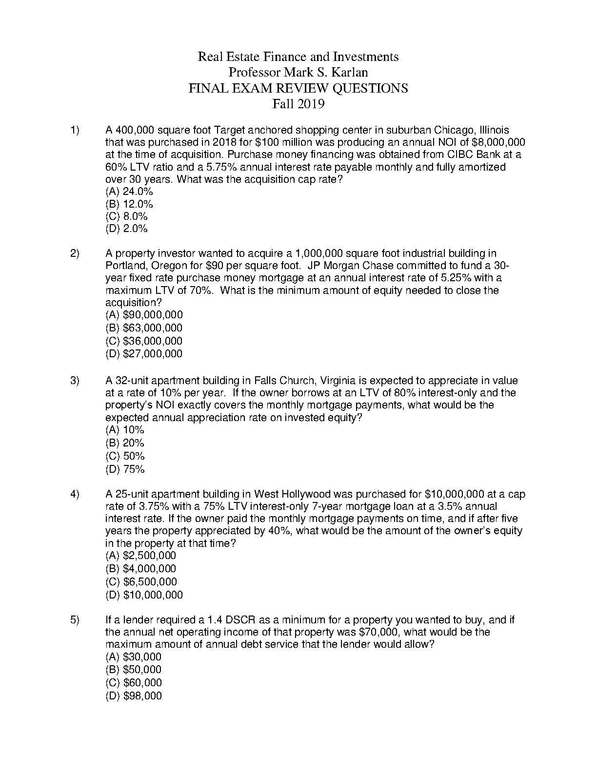 Real Estate Finance and Investments: Final Exam Review Questions (Fall 2019) by Mark S. Karlan