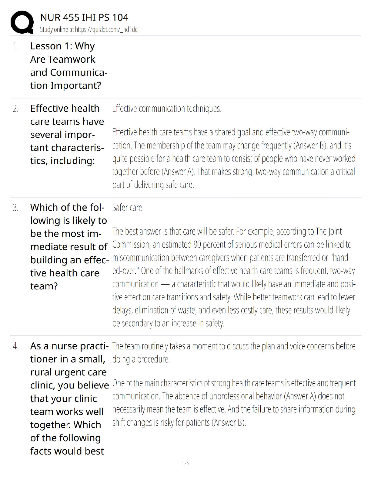 NUR 455 IHI PS 104: Teamwork and Communication in Healthcare - Study Guide for 2024/2025