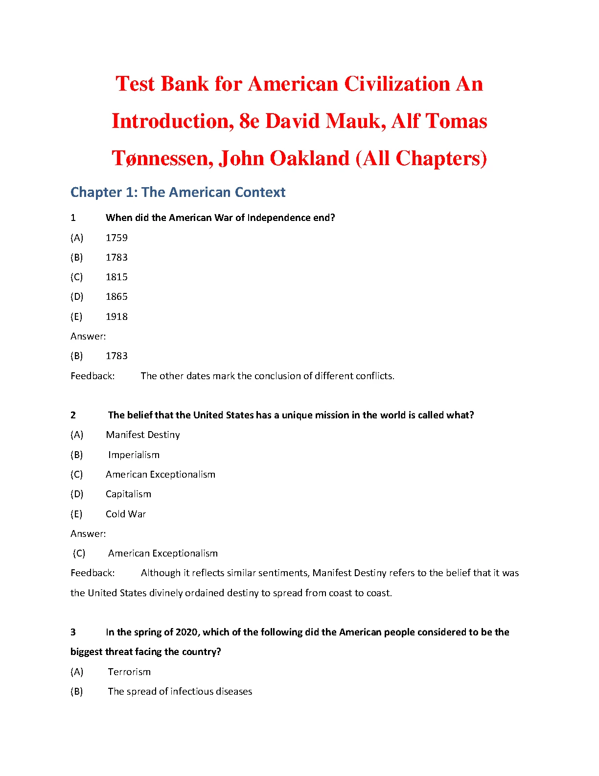 Test Bank for American Civilization An Introduction, 8TH EDITION BY David Mauk, Alf Tomas Tønnessen, John Oakland (All Chapters)